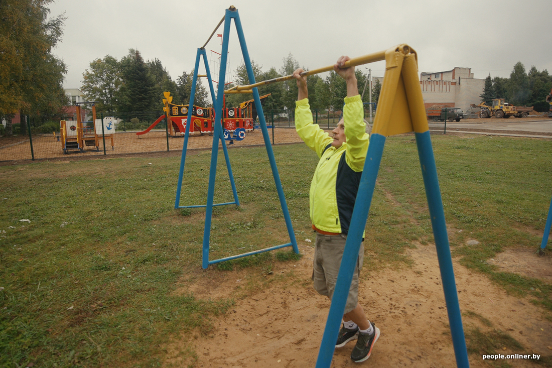 Бежим дальше и разгоряченными телами обогреваем Бигосово всеми силами. Это сейчас в квартирах тепло, а на момент съемки — холодно. Кстати, в юности таким же холодным был и Леонид в отношении спорта: турник игнорировал, в кедах лишь красовался на танцах, а плавал только летом на пляже.