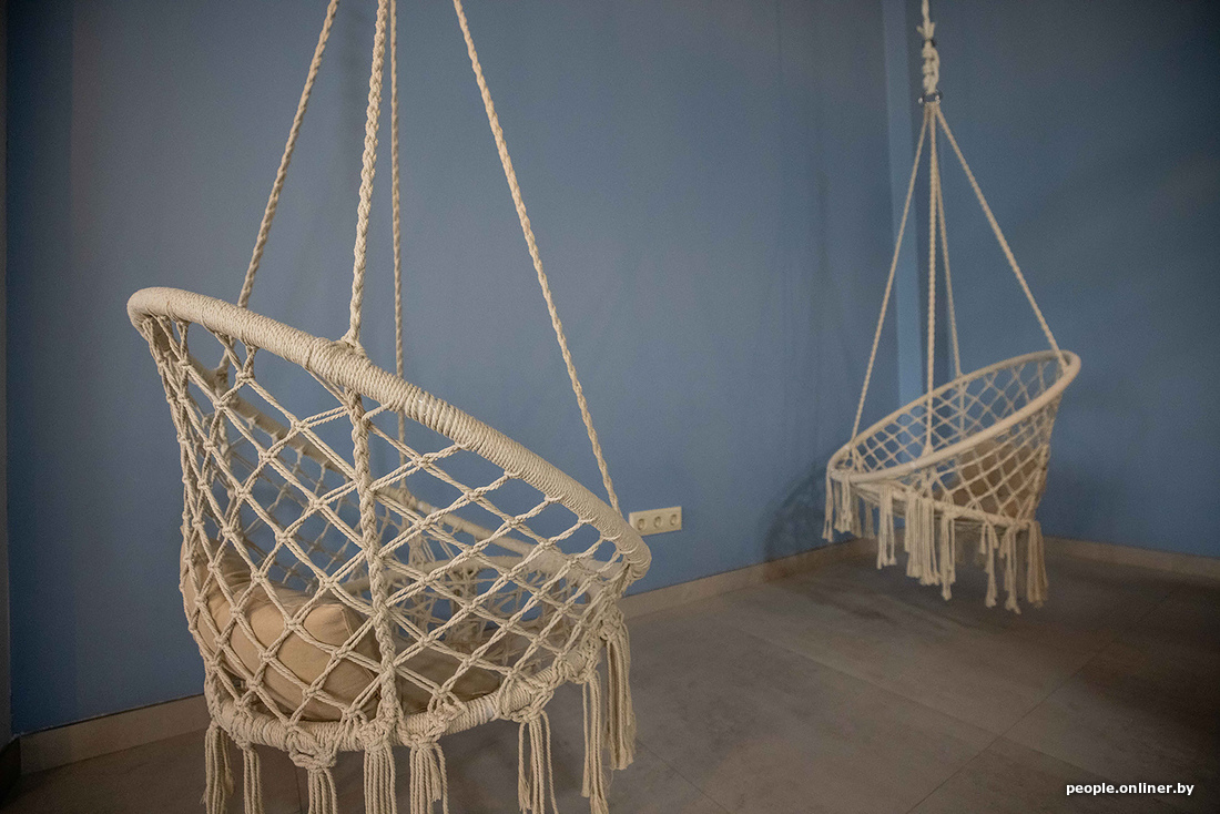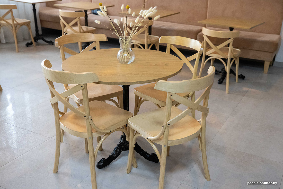 Интерьер бежевенький, домашний, деревянный. Много площади, мало наполнения — не шибко уютно. Кухня вроде и открытая, но совсем не видно, что на ней происходит. Лучше было в принципе оставить ее за закрытой дверью. Внутри холодно и тихо. Фишкой заведения можно назвать плетеные подвесные кресла. Идея хоть и не новая, но хорошая: кресла делают атмосферу уютнее и, скорее всего, часто мелькают в сторис. В целом видно отсутствие дизайнерской руки, но, возможно, заведению стоит просто подольше обжиться.