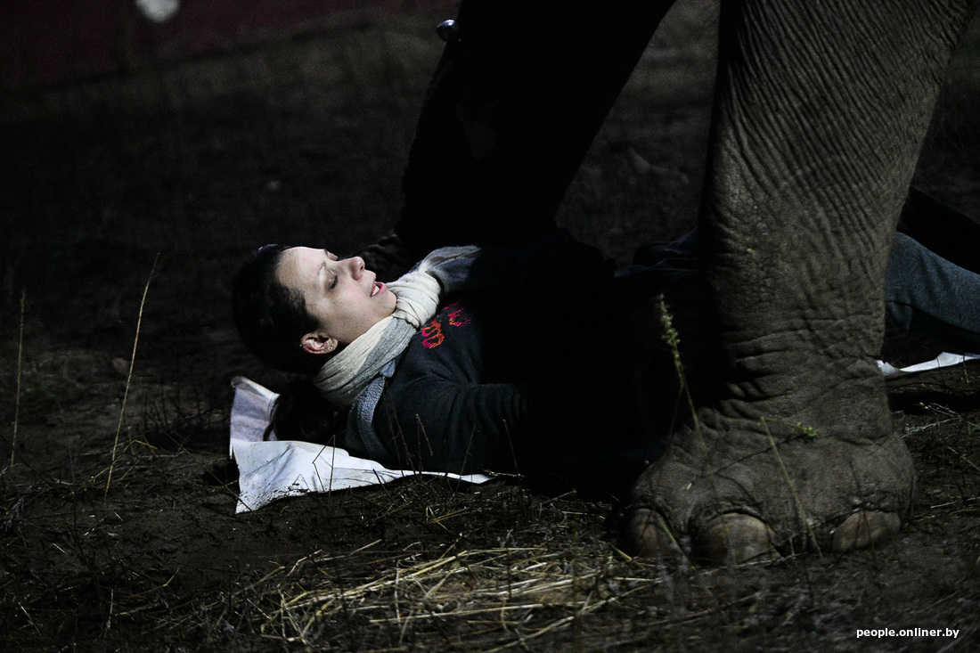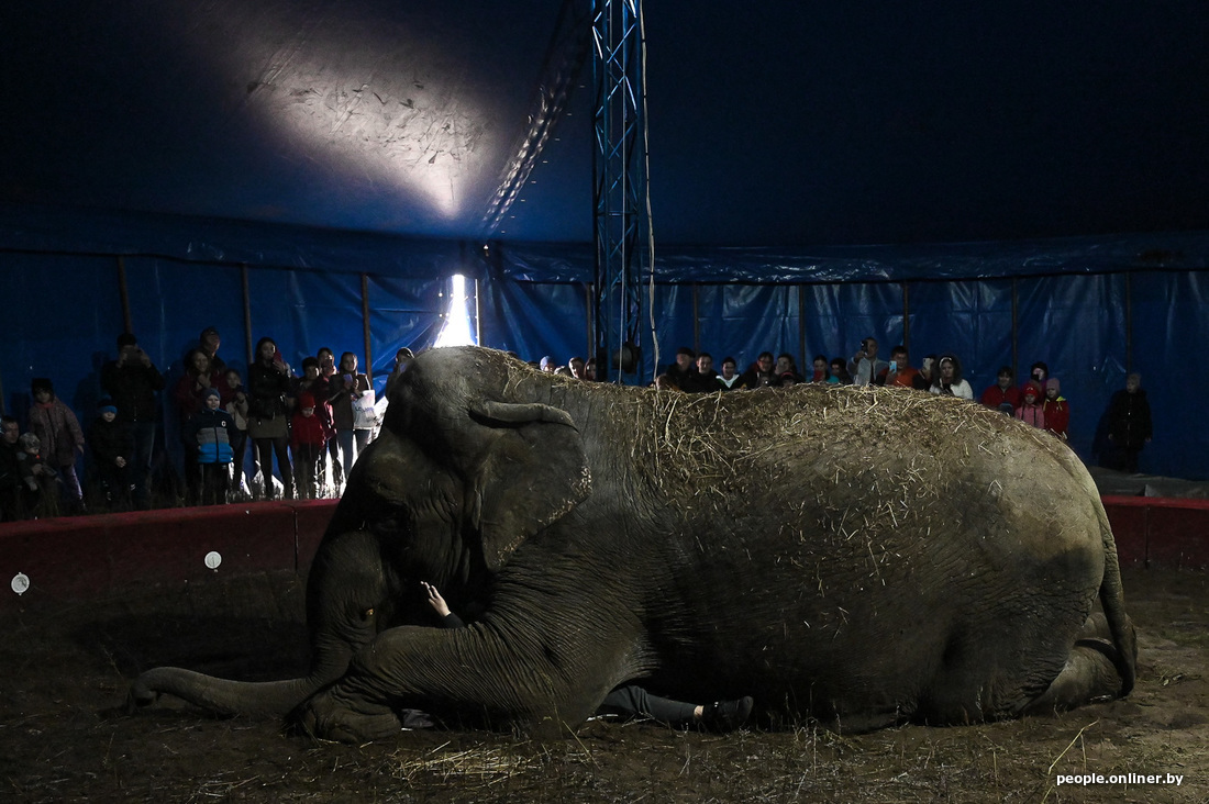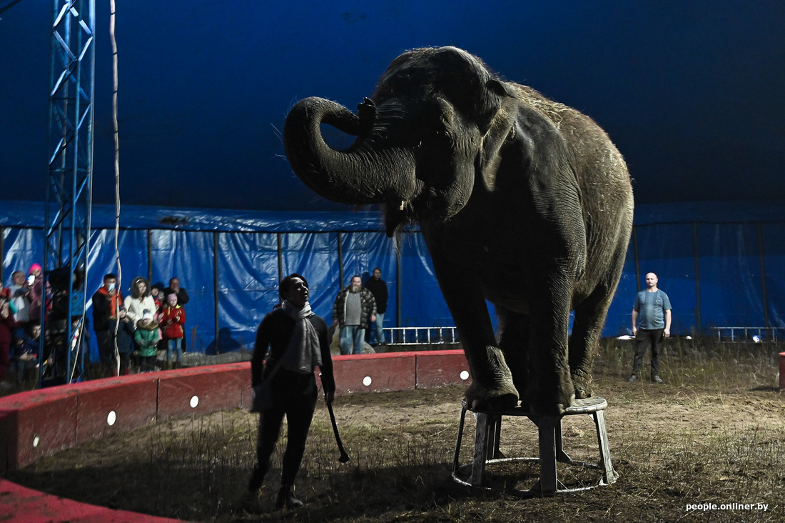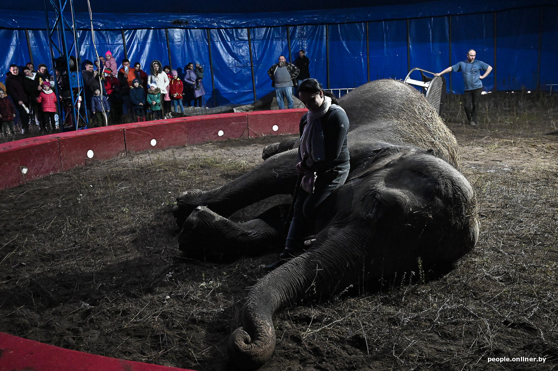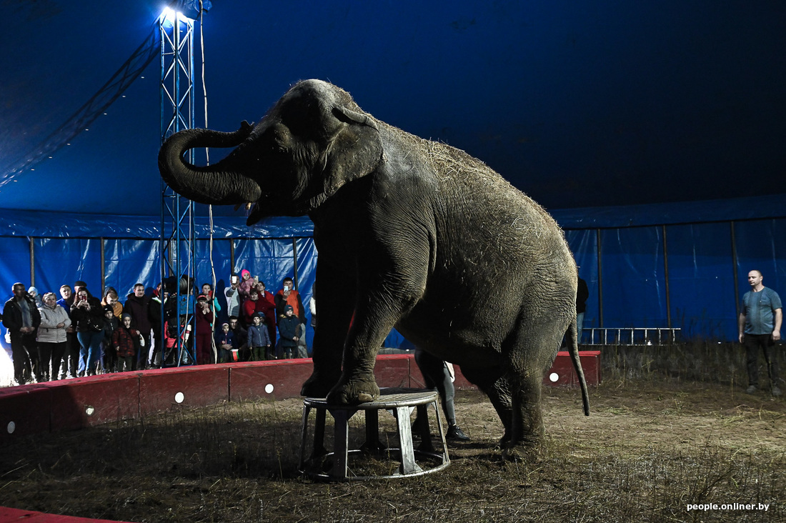 Индийский слон уже чуть больше месяца зависает в поселке Новинки Слуцкого района. Обычная такая деревня: несколько улиц, в конце которых дома граничат с загонами для коз и овец. Здесь царят тишина и спокойствие. Но если продвигаться на окраину, картина резко меняется: на пятачке стоят десятки раскрашенных прицепов, фур и легковых автомобилей, так что даже припарковаться негде. Горизонт скрывается за куполом шатра, а под ним — толпа людей с пакетами овощей. Все это база цирка «Антре», где и приютили итальянскую артистку с ее зверинцем.