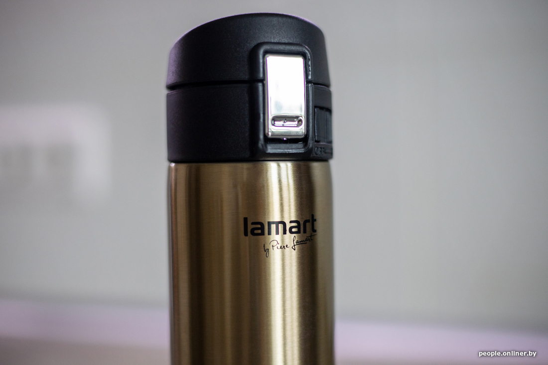 Еще одна модель термокружки, но с более ярким дизайном. Золотистый глянцевый корпус. Открывается с помощью механизма с кнопкой, а также имеет фиксатор, предотвращающий случайное открывание. Объем — 420 миллилитров.