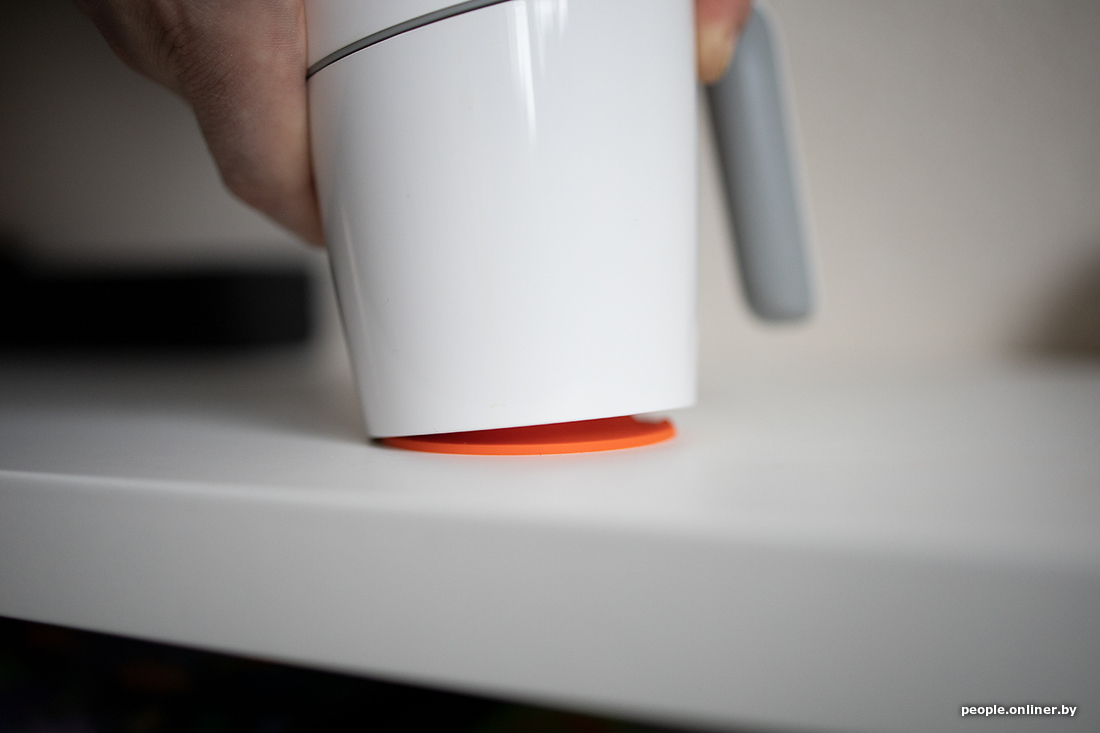 Еще одна термокружка, которая не только имеет оригинальный дизайн, но и практична в использовании. Если вы случайно заденете чашку, надежная присоска-крепление удержит ее на поверхности, не дав «смахнуть» на пол. При этом ее легко отсоединить от стола: достаточно просто поднять вертикально вверх. Оборудована специальной крышкой, которая предотвращает расплескивание. Объем — чуть менее полулитра.