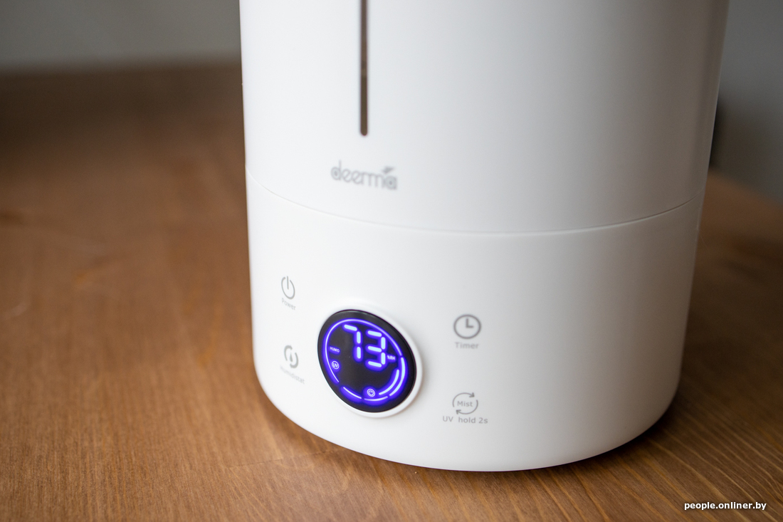 Управление электронное, сенсорное. Все достаточно просто и интуитивно понятно. Экран увлажнителя показывает текущий уровень температуры и влажности. За поддержание последнего показателя в комнате отвечает встроенный гигростат: достаточно просто задать нужный уровень влажности от 45 до 90 процентов. Увы, точность датчика сомнительна, ведь он встроен в корпус и меряет влажность прямо у самой крышки. Но это проблема всех подобных устройств. Доступны три уровня увлажнения. Дисплей можно отключить, долго удерживая кнопку таймера, чтобы он не раздражал в темноте.