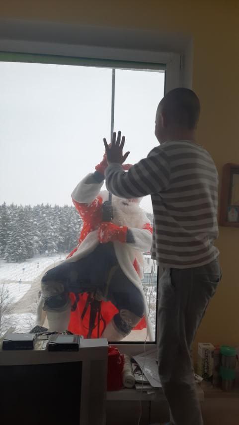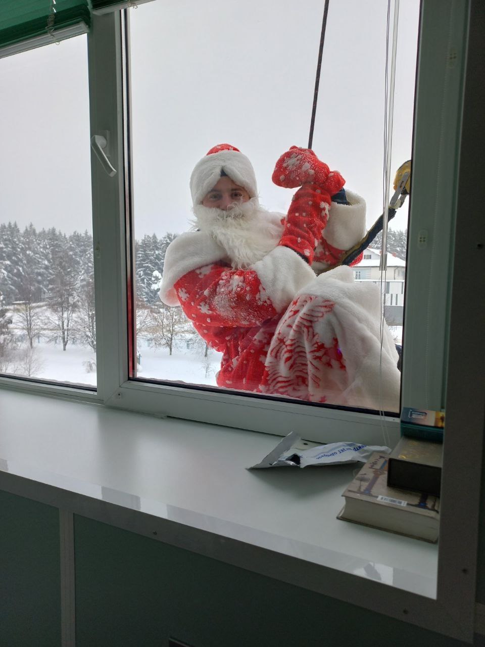 В ушедшую субботу в страну вернулись Деды Морозы, и, кажется, дел у них невпроворот. Наш читатель случайно стал свидетелем, как в РНПЦ детской онкологии четыре «дедушки» и одна «внучка» вручали подарки малышам. Но так как печной трубы в здании не было, да и старомодно все это, праздник детям постучал в окно.