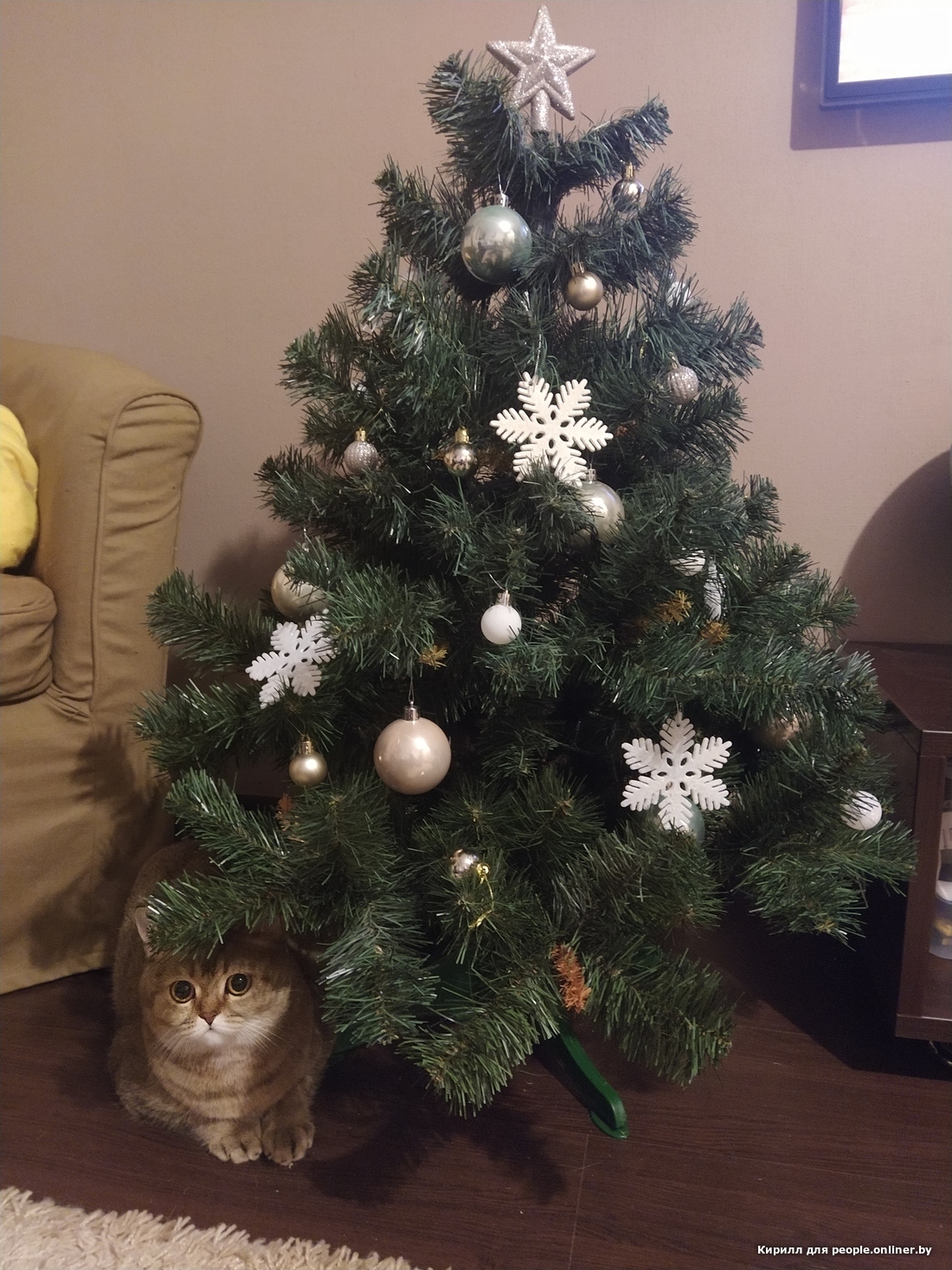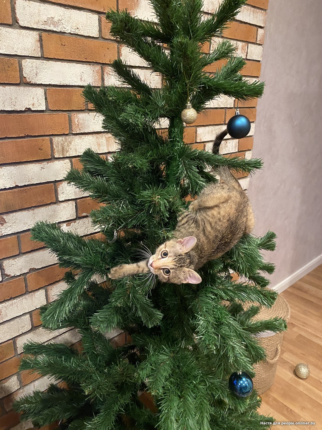 Ирина сообщает: «Кот Раф любит прятки. Любимое место — за елкой. Игрушки первые два дня не трогал, но сейчас стабильно каждый день под елкой лежит минимум один шар».