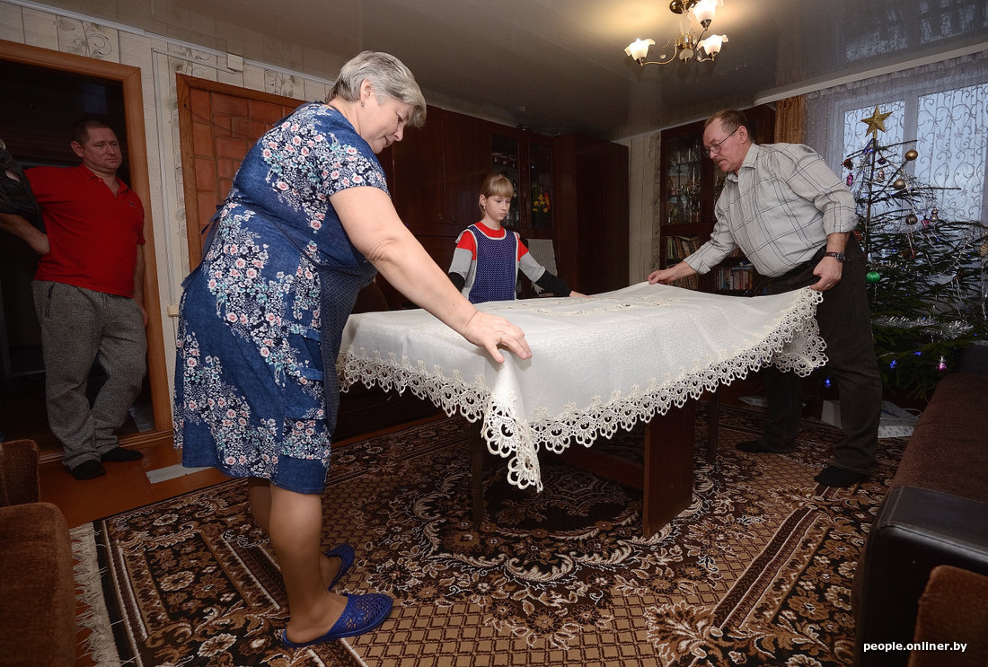 У падрыхтоўцы заўжды ўдзельнічаюць дзеці і ўнукі. Ставім стол, кладзём сена і заўсёды засцілаем самым прыгожым абрусам.