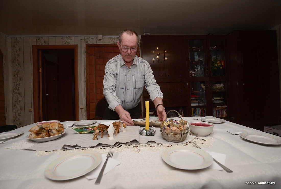 — Так прынята ва ўсёй вёсцы. Хто адкуль, але ўсё павінны прыехаць да бацькоў. Мы святкуем гэтак, як і нашыя продкі. І як яны рабілі вігілію, так і мы робім. І хоць дзеці прыязджаюць часам з самага ранку, ніхто на стол мясную ежу не падае. Посны дзень значыць посны, — кажа гаспадыня. — А як першая зорачка з'явіцца, значыць, зачынаецца свята, усе сядаюць за стол.