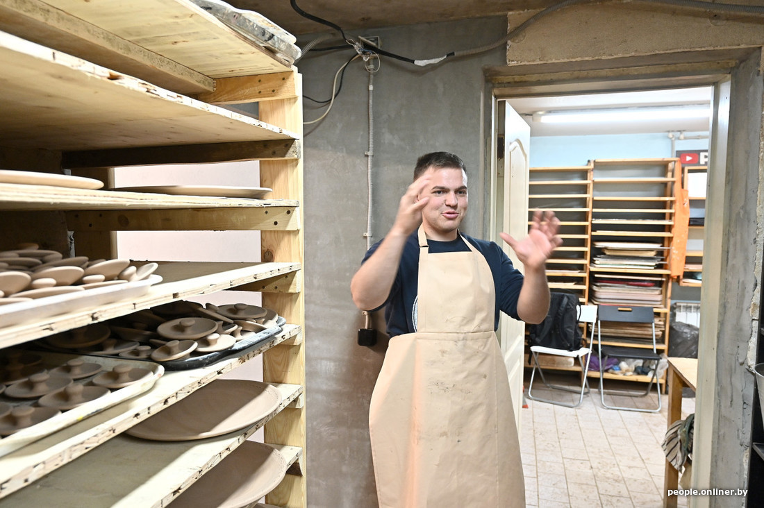 Вообще, гончарство — достаточно вредное для здоровья ремесло: часто работы выполняются в плохо освещенном помещении, также мастера постоянно окружает пыль и влажность. Но Саша не жалуется, а по его внешнему виду и веселости не скажешь, что парень хотя бы минимально страдает. Даже наоборот — руки крепкие, как камень.