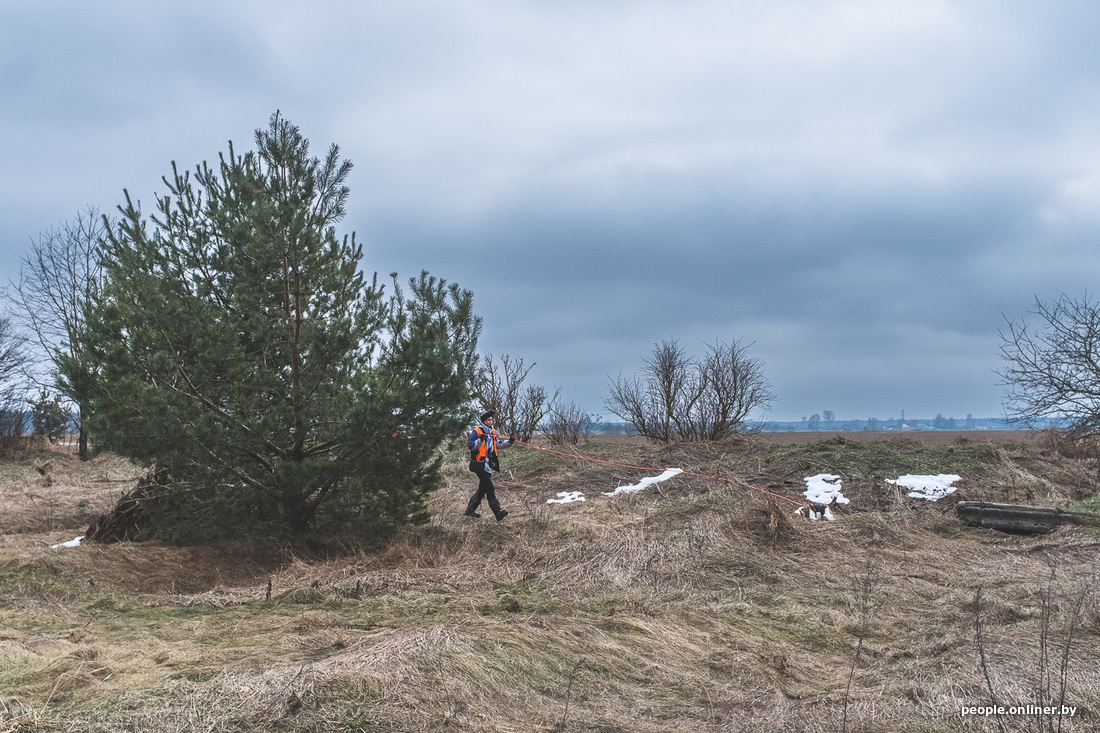 Па багне і ярах мы крочым закладваць статыста. Статыст сёння я (наогул, пасада дэфіцытная). Нам сказалі, што нейкія адмысловыя сабакі з лёгкасцю знойдуць мяне ў гэтых нетрах. Спадзяюся, яны зробяць гэта раней, чым я акалею з холаду і нуды. Рэч у тым, што ў краіне нядаўна стварылі пошукавую кіналагічную службу пры атрадзе «Анёл». Ідзём глядзець, як гэта працуе. На сабе паспрабуем розныя спосабы.