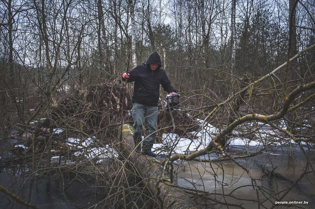 Балота сцягнута подлай ледзяной скарынкай, мы з трэскам прабіраемся па купінах, карчагах і паваленых дрэвах.