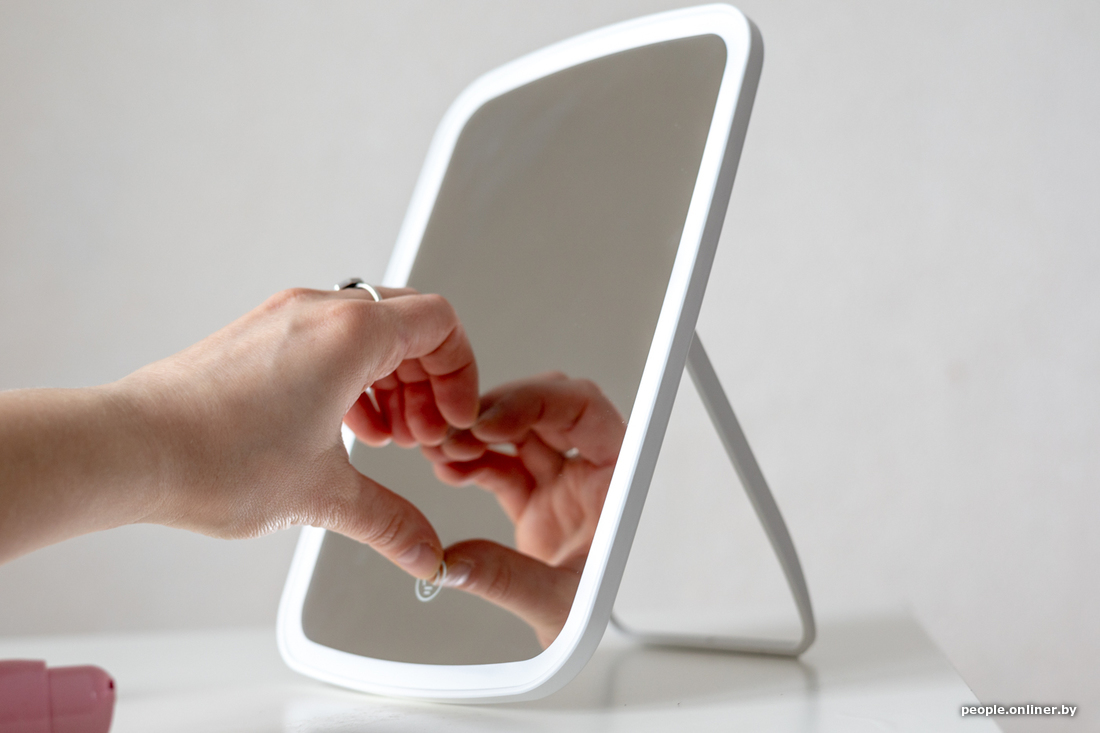 Это милое зеркальце мало кого оставит равнодушным. Очень легкое, компактное, но в тоже время его размера достаточно для процедур самолюбования, макияжа, селфи и так далее. Также имеет увеличительное стекло с пятикратным зумом, двухстороннюю подсветку. Работает от батареек. Угол наклона можно регулировать.
