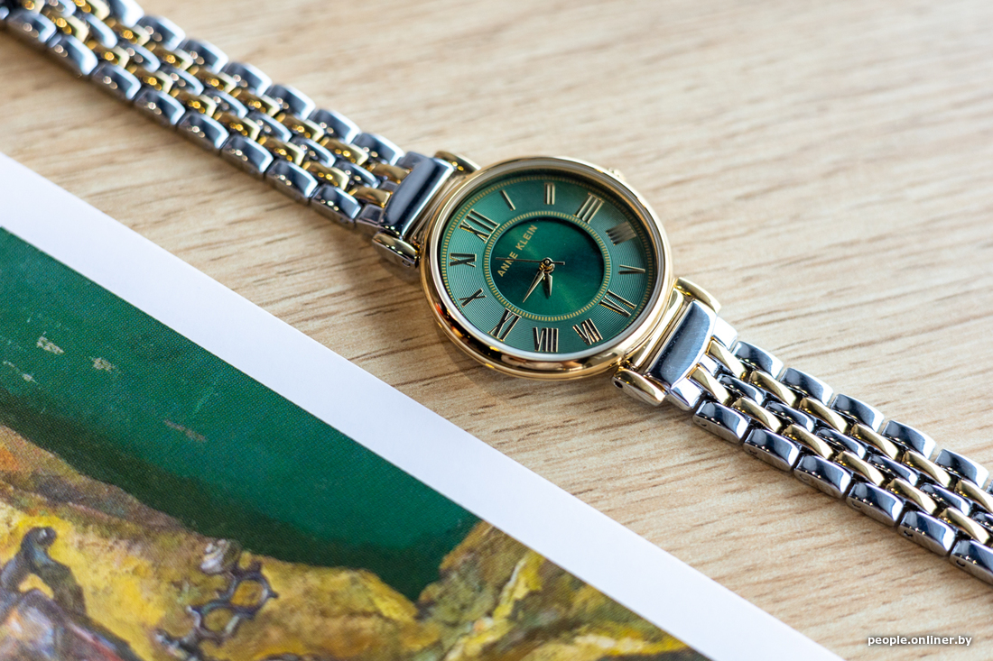 Часы выполнены в элегантном классическом стиле. Циферблат контрастный, темно-зеленого цвета, бросается в глаза. Римские цифры добавляют строгости. А вот сочетание цветов золота и серебра, субъективно, спорное. Впрочем, найдутся и те, кому такое понравится. Есть варианты и других расцветок.