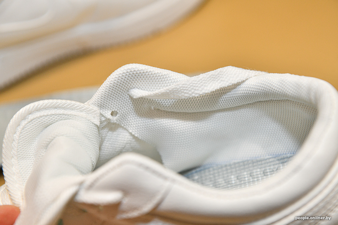 Вывод можно сделать даже по отверстиям. На нашей поддельной паре на одной ноге они сделаны внутрь, а на другой — наружу. У оригинальных кроссовок отверстия всегда будут идти вовнутрь, а значит, будут гладкими на ощупь.