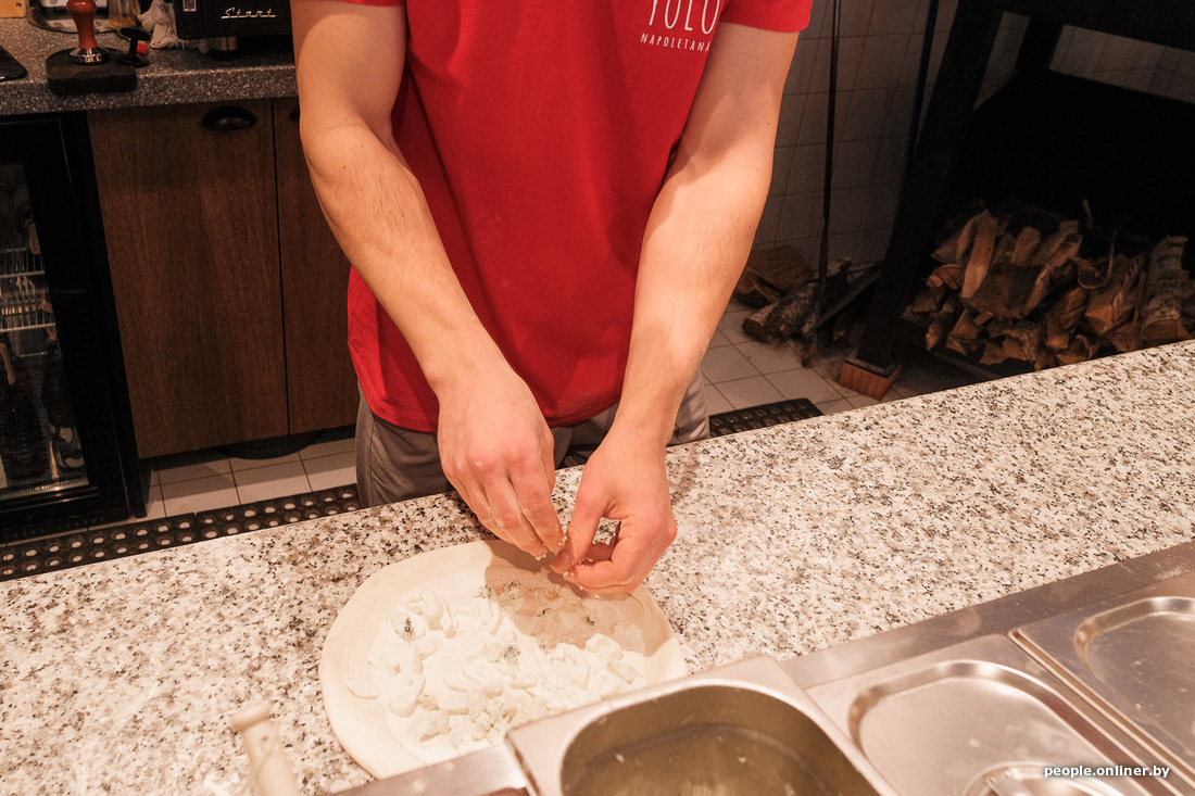 Кухня традиционно открытая, чтобы все видели, как пиццуля выпекается в большой печи, достается на лопате и вынуждает пускать слюнки. Напомним, что такое неаполитанская пицца: она обязательно выпекается в каменной печи при высокой температуре, тесто в середине тонкое, но края пышные. Еще края обязательно должны заметно подгореть. Сама пицца небольшая.