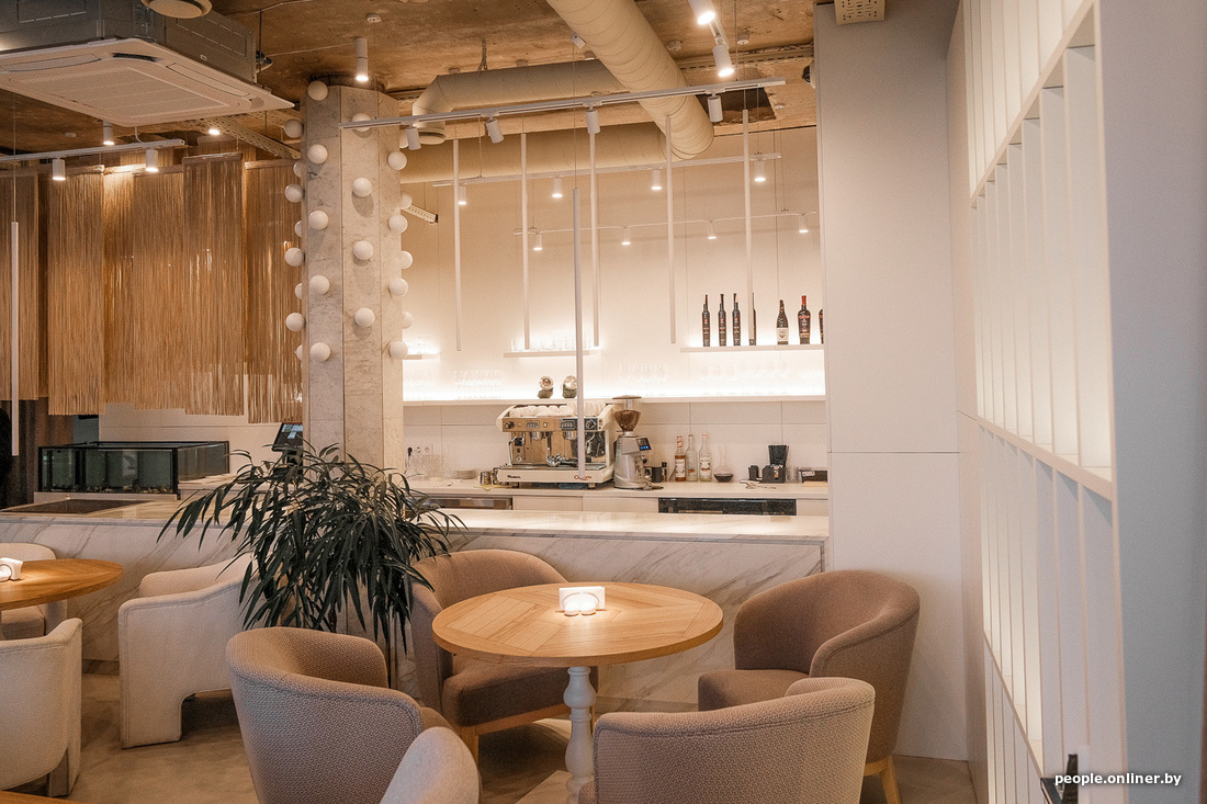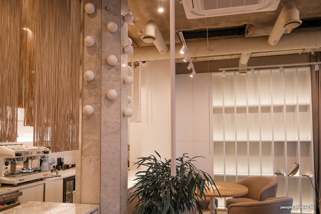 Внутри встречают, провожают — все чинно и благородно. Про интерьер ничего плохого сказать нельзя, так как его сделали действительно уютным. И несмотря на обилие света и открытое пространство, за некоторыми столами чувствуешь себя весьма кулуарно и в зоне комфорта. Ощущения такие: белым-бело, светло, мягко, современно. За барной стойкой — красивая белая кофемашина и фотогеничные детали. Бармен мутит коктейли, которые с виду тоже авторские и непростые.
