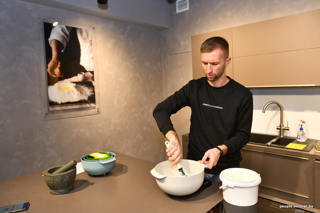 Илья сразу принялся помогать Максиму у плиты. По его словам, он настоящий сладкоежка, сам любит всевозможные чизкейки, брауни и за раз под чай спокойно может слопать плитку шоколада. При этом лишний вес Трачинский не набирал, и любовь к сладостям никак не мешала его карьере.