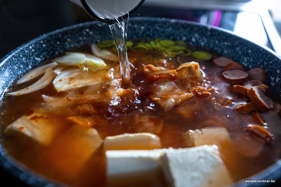 Итак, финальный босс с самым внушительным списком ингредиентов. Для приготовления простого варианта традиционного budae jjigae, которое подают едва ли не в каждой южнокорейской столовой, понадобятся: колбаски, сыр тофу, репчатый лук и порей. Кроме того, долгожданный guest star мероприятия — кимчи.