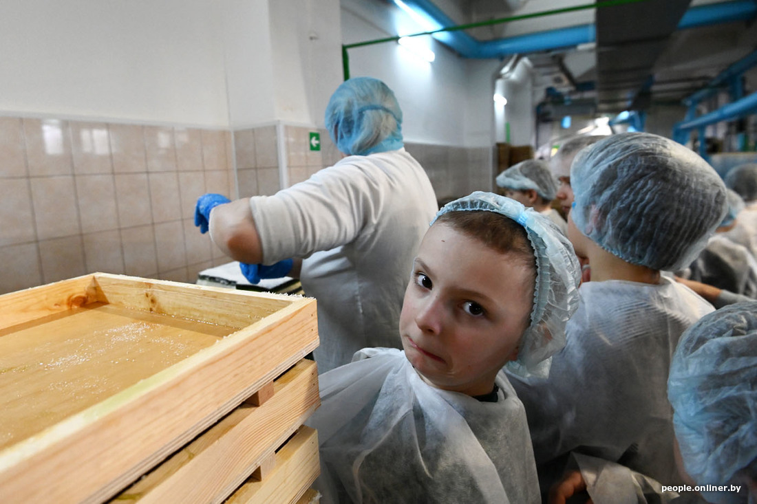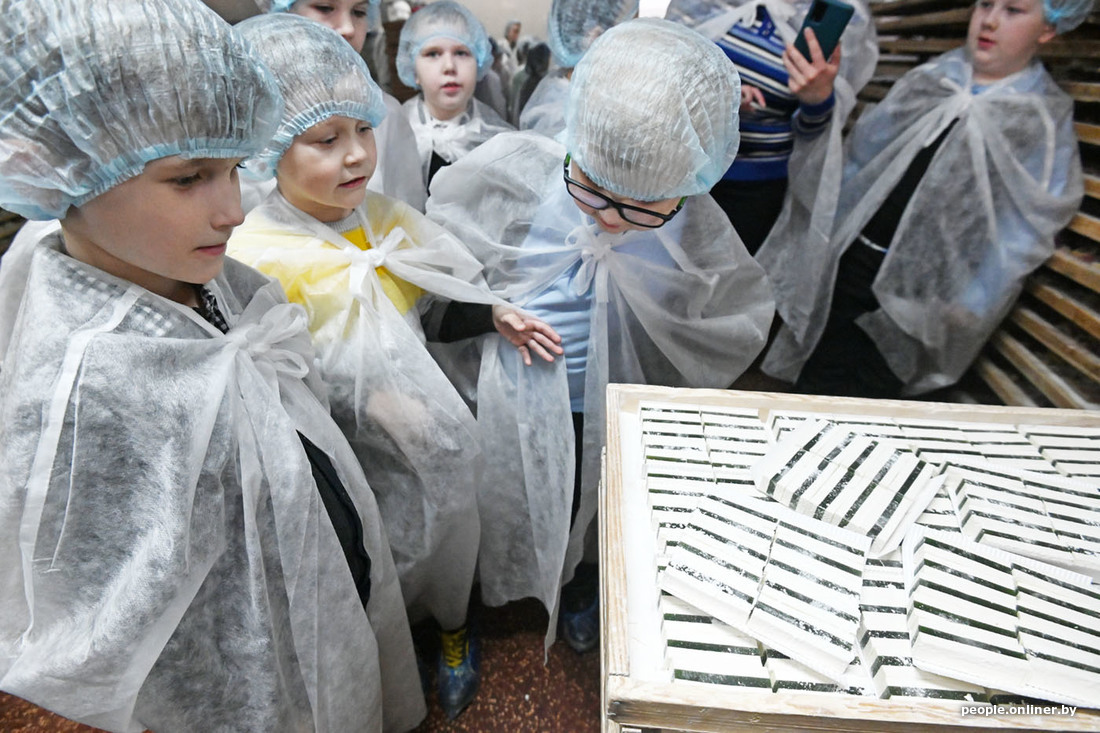 Пространство вокруг фабрики заполнено плотным карамельным запахом. Прямо в него из автобуса вываливается толпа малышни. Педагоги зычными голосами стараются придать галдящей массе форму. На этот раз приехали школьники из Калинковичей.