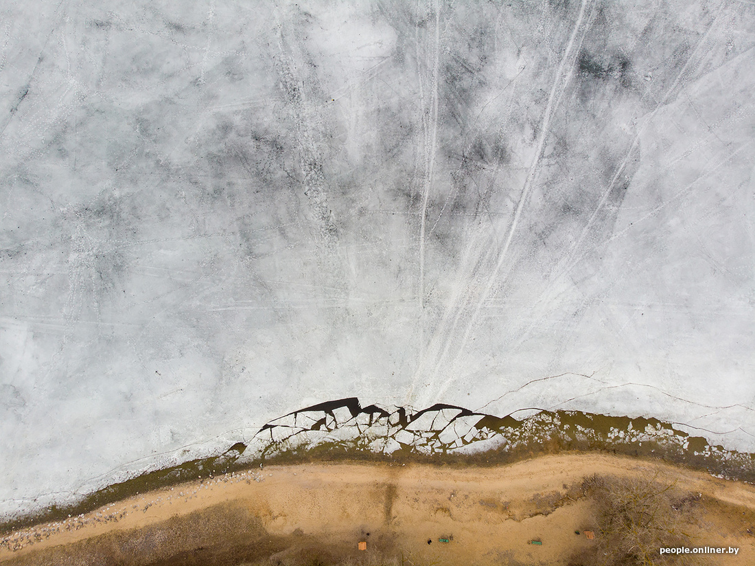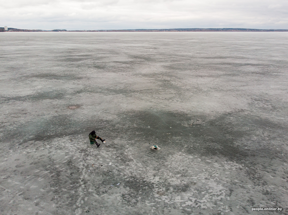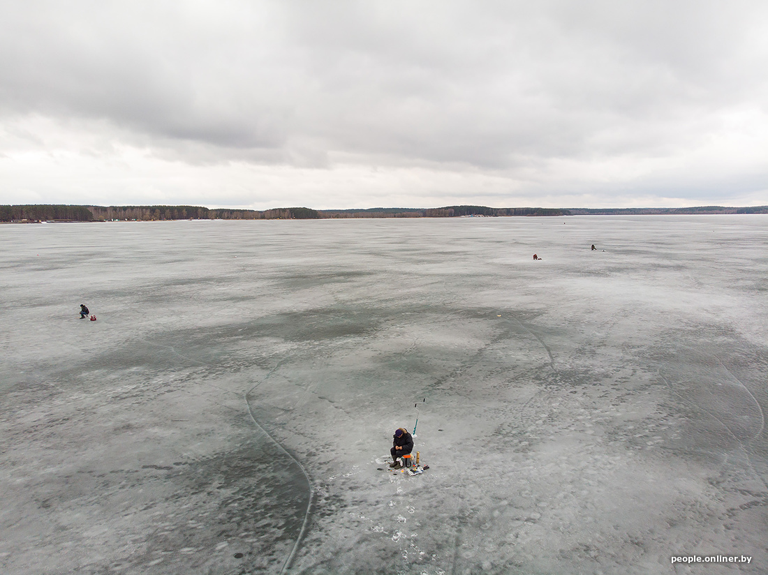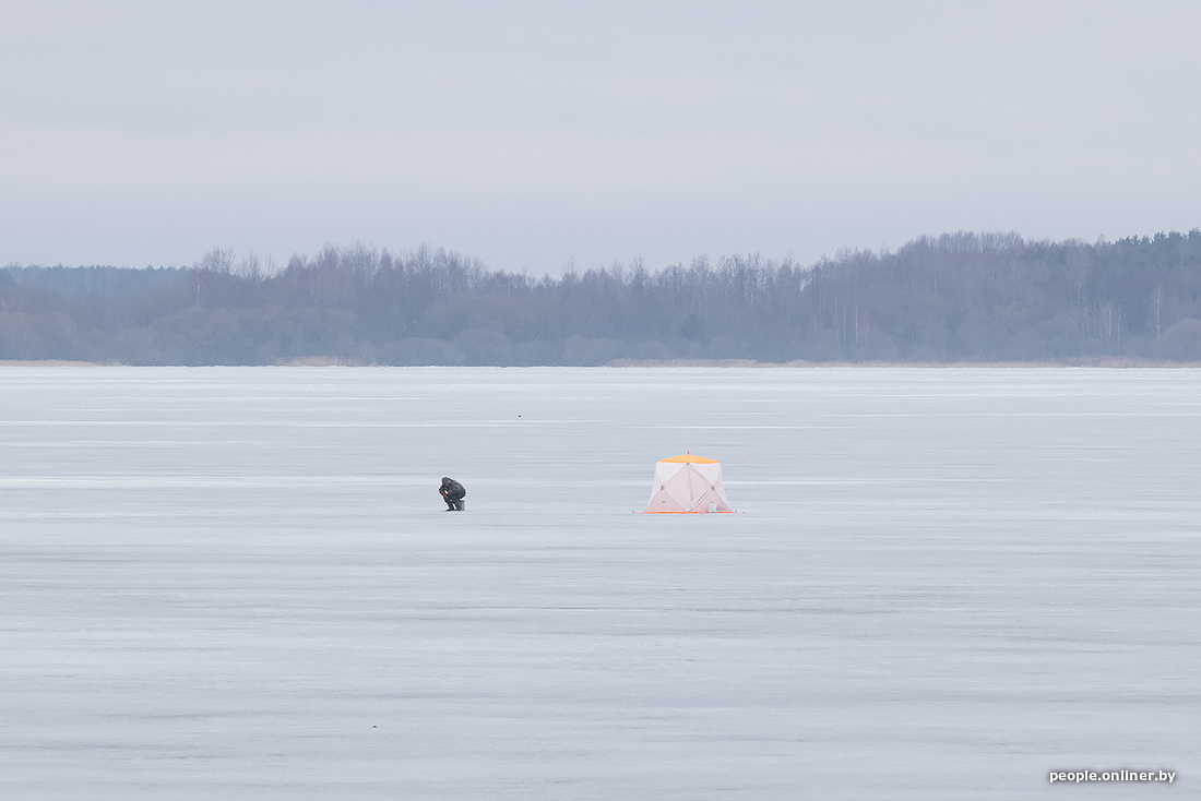 О том, что с водоемов сходит лед, предупреждают не только медиа, но и в специализированных пабликах. «А лед-то слабеет. Местами промоины, и гуси плавают. На льду каша. И хотя [лед] сантиметров 20, а идешь, и из лунки вода плюхает. Но две палатки бессмертных стояли сегодня напротив Чижевичей», — написали в группе, посвященной Вилейскому водохранилищу. Прозвучало заманчиво, и в поиске бесстрашных рыболовов мы первым делом отправились на водоем в деревню Сосенка.