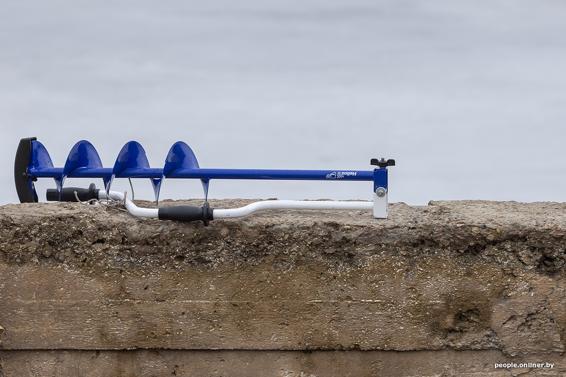 И точно, километрах в пяти от Сосенки мы обнаружили небольшую группу рыбаков, застывших над своими лунками. Тут вам, конечно, не Заславское водохранилище: чтобы выйти к воде, нужно преодолеть мощный парапет, отделяющий бетонный берег от дороги.