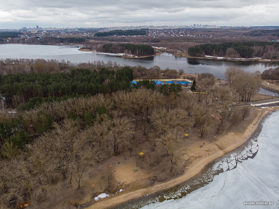 Едем дальше. Заславское водохранилище, оно же Минское море. Одна из главных зимних забав здесь — прогулки по замерзшему водоему. Адепты пляжа №5 могут припомнить, как раньше смельчаки даже гоняли по «морю» на спортивных мотоциклах. Но сейчас здесь тихо, а на льду никого, кроме парочки рыбаков. От берега лед отделяет широкая полоска воды, и добраться до него может либо прыгун в длину, либо человек в сапогах.