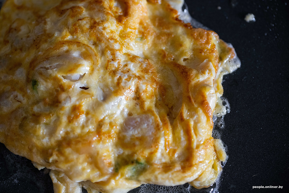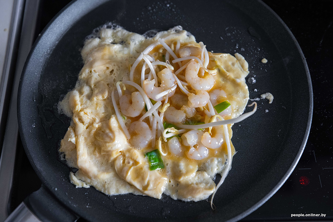 Жарить омлет фу йонг нужно примерно как оладушки: зачерпываем порцию яично-креветочно-ростковой смеси, выливаем на раскаленную сковородку (масла побольше) и не даем расползаться по всей поверхности. Схватились края — подворачиваем. Подрумянилось — переворачиваем на другую сторону и доводим до той степени готовности, какую любите. Повторяем пока не закончится смесь.