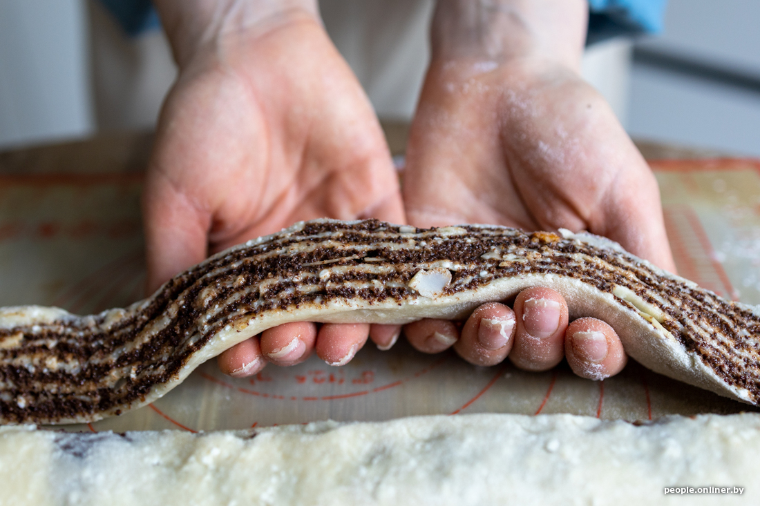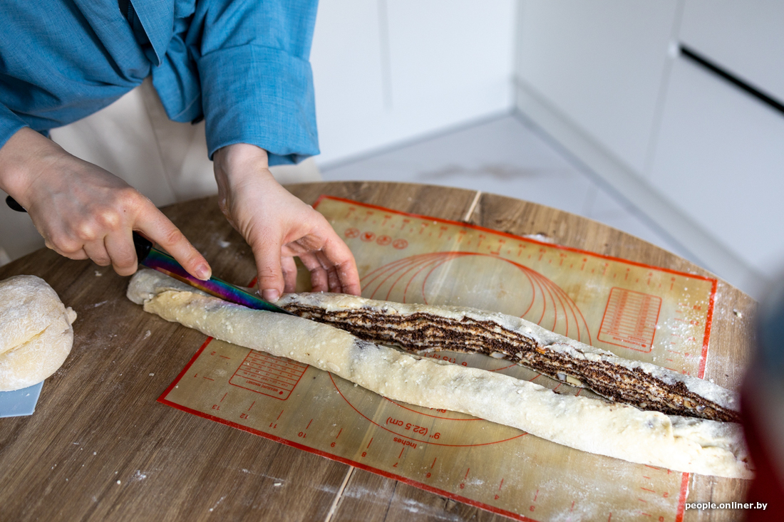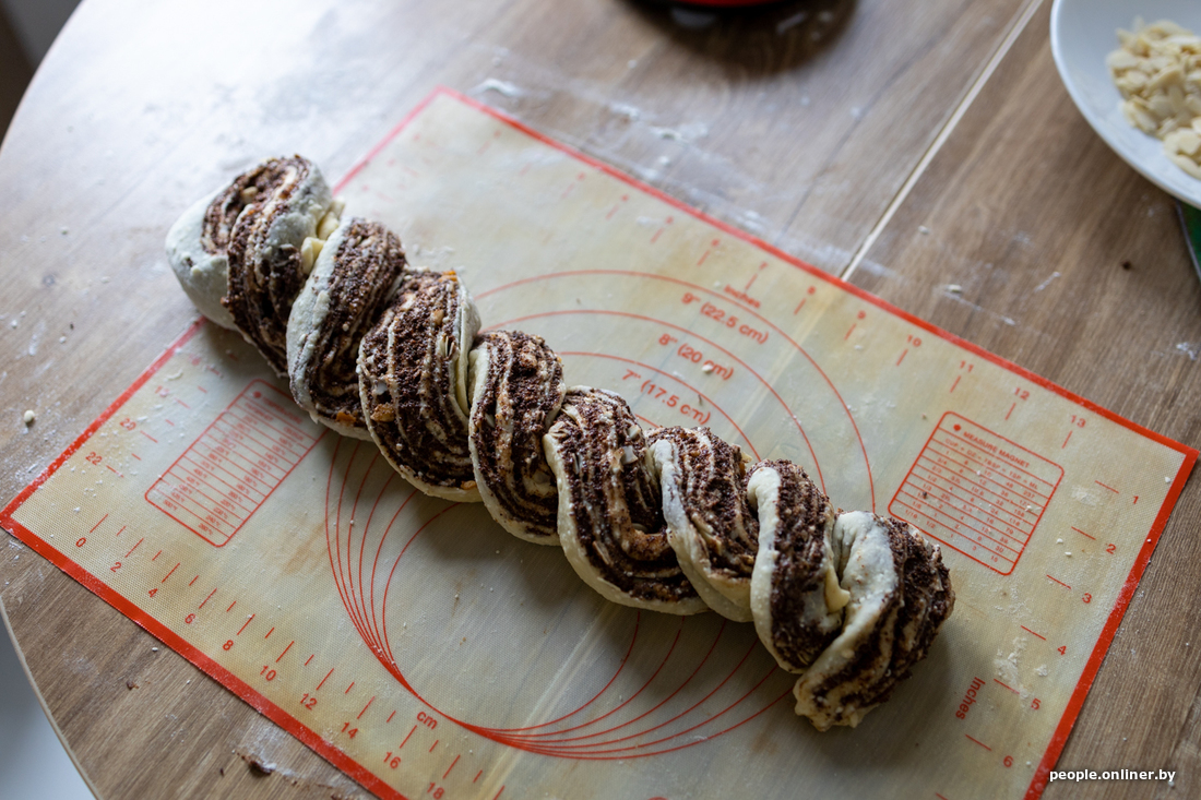 Готовый пласт скручиваем в плотненький рулет, края защепляем. Получившийся рулет разрезаем на две части с одной стороны. Далее начинаем переплетать, помещая полоску разрезом вверх, чтобы остался красивый узор.