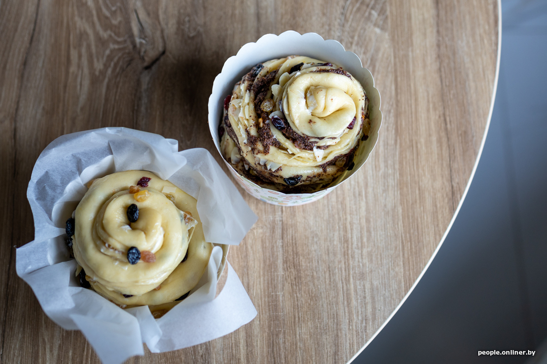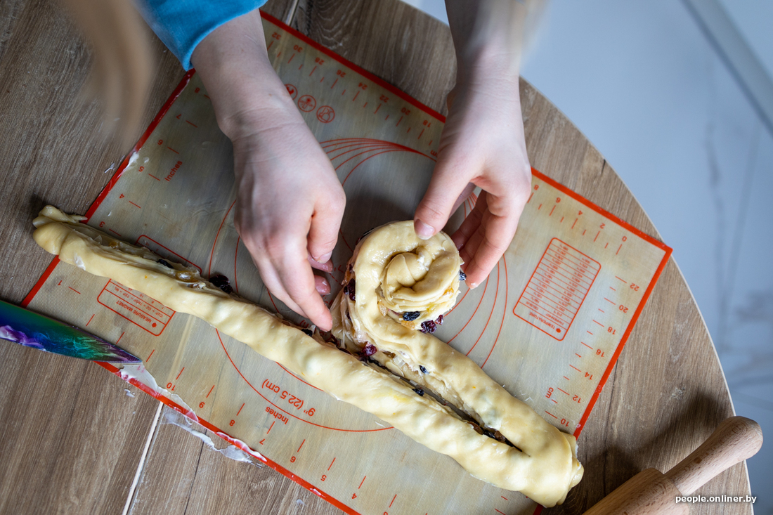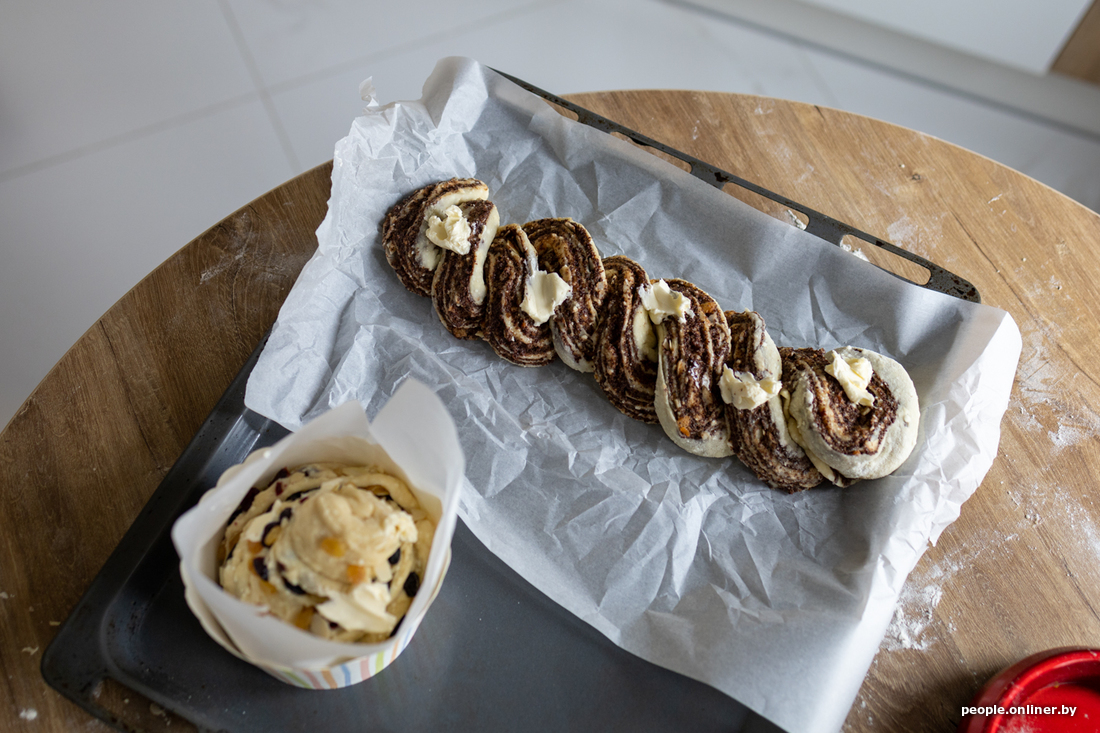 Когда начинка распределена, начинаем скручивать плотные рулетики. Готовый рулет разрезаем вдоль пополам, не доходя с одной стороны до конца примерно 2—3 см. Сворачиваем одну часть рулета улиткой так, чтобы разрез был снаружи. Затем продолжаем скручивать таким образом вторую часть. Аккуратно переносим краффины в формы. Подготовленные куличи накрываем полотенцем или пищевой пленкой и отправляем в тепло на 30 минут для подъема теста.