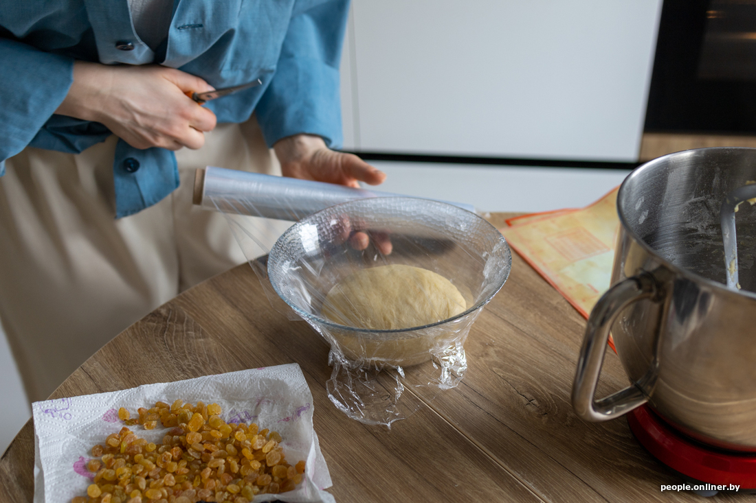 В готовое тесто добавляем изюм с клюквой и все тщательно вымешиваем. Плюс я решила добавить немного маковой смеси. Тесто получилось нежным и мягким. Накрываем его пищевой пленкой и ставим на час-полтора в теплое место. Я обычно ставлю в духовку, разогретую на 30—40 градусов.