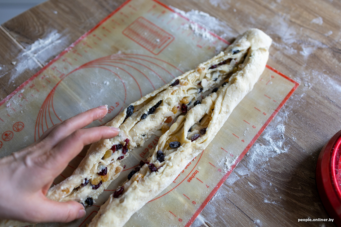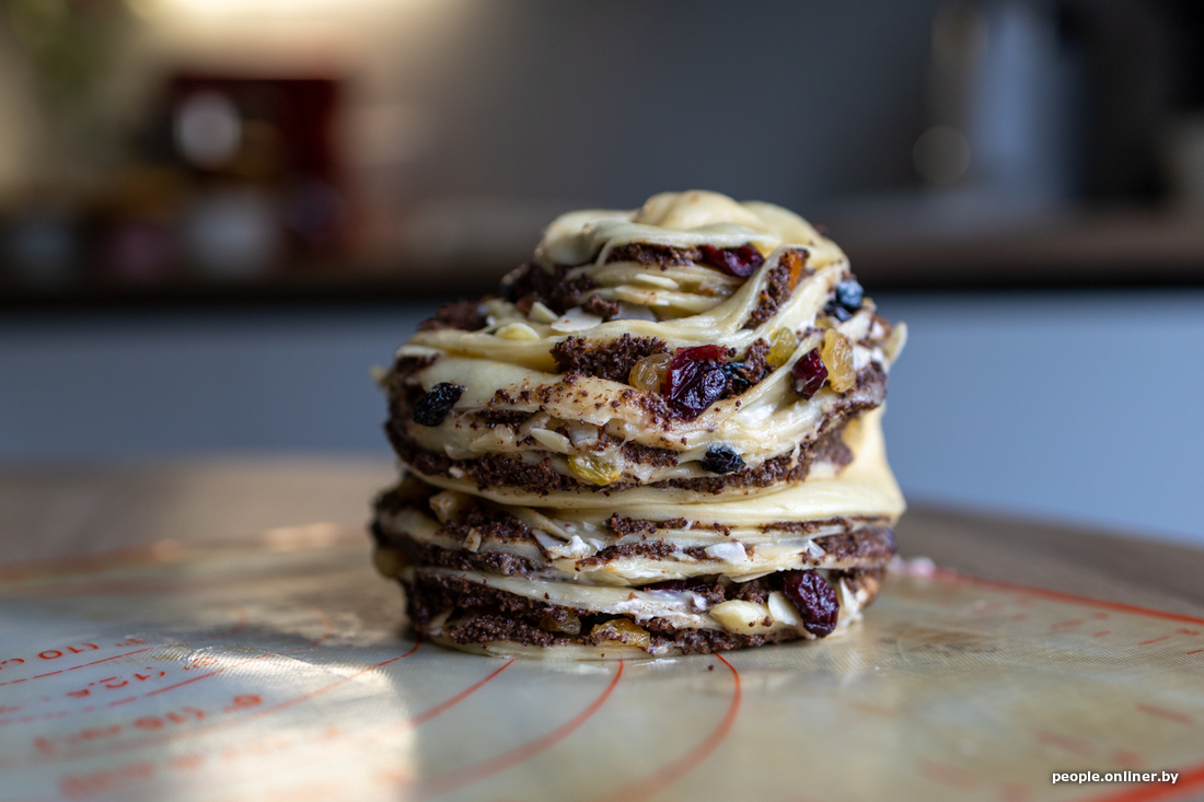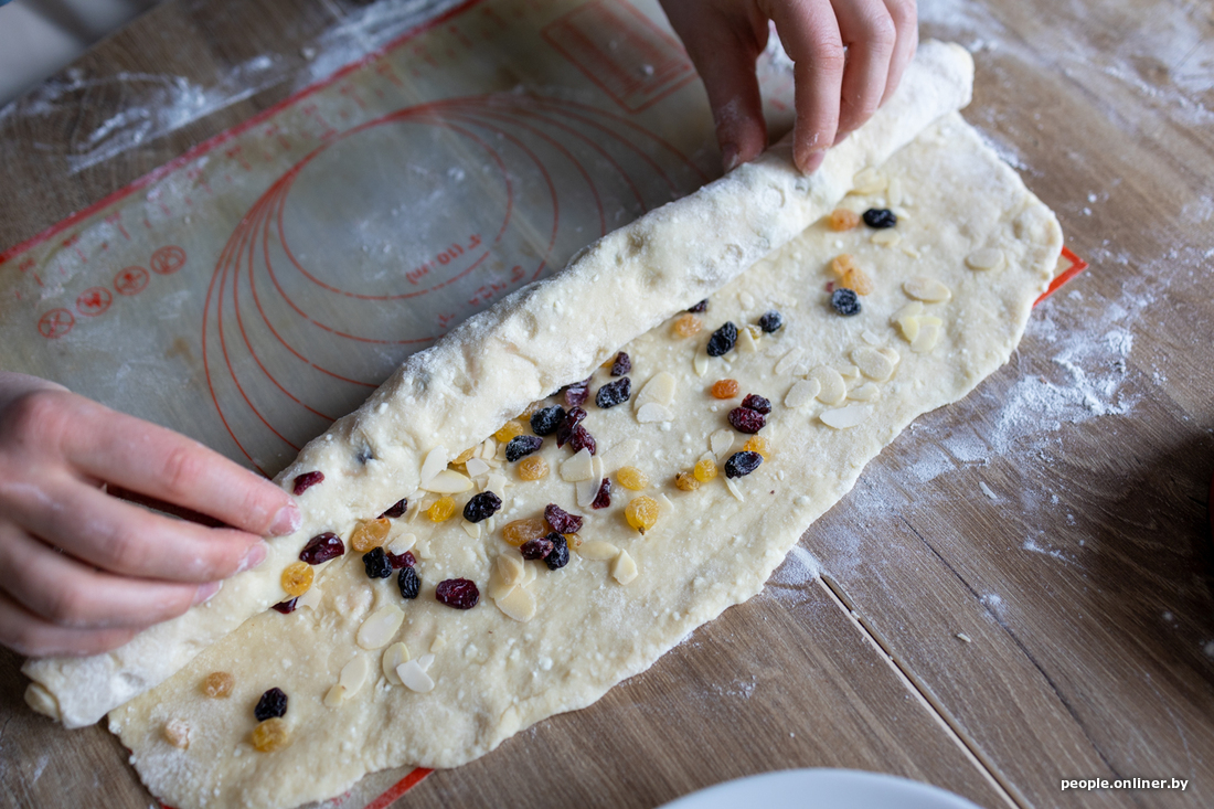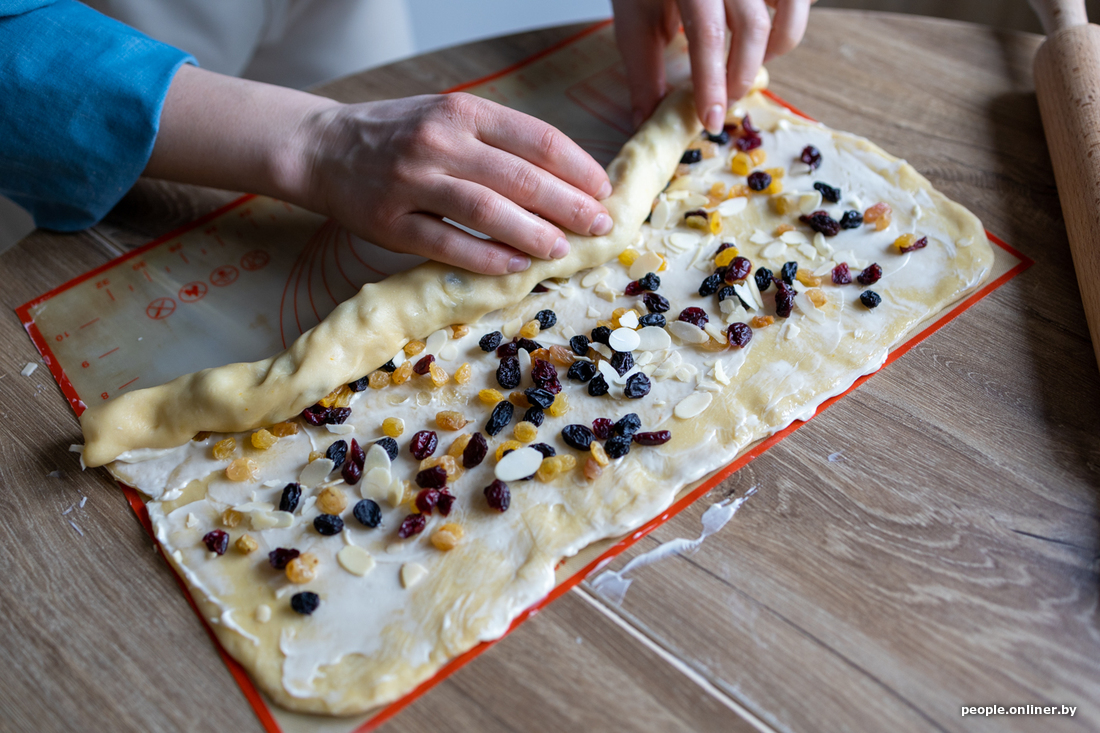 Я пекла рулет-плетенку и кулич, поэтому один пласт теста смазала маковой начинкой, а второй посыпала изюмом и клюквой.