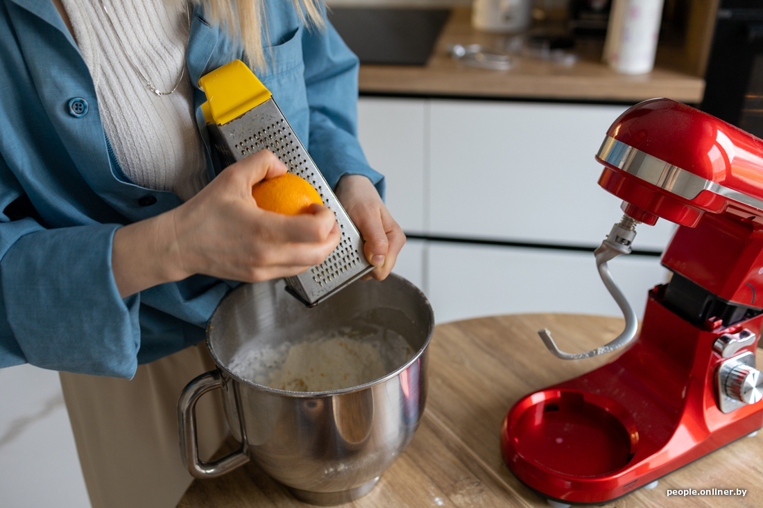 После вливаем теплое молоко и всыпаем дрожжи. Добавляем цедру апельсина. Снимаем цедру с при помощи мелкой терки — и только оранжевую часть, белую не трем. Тщательно все перемешиваем.