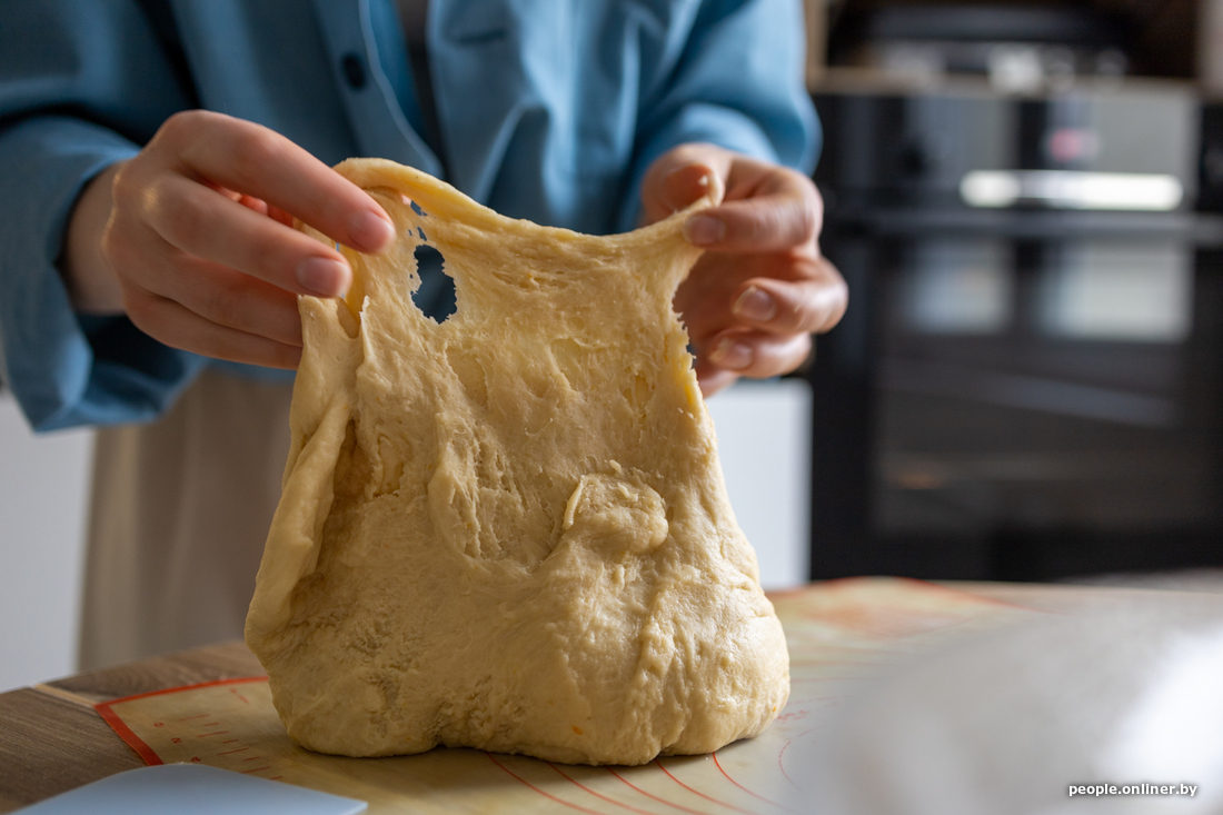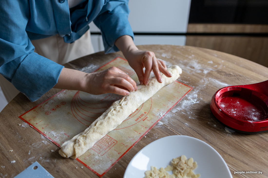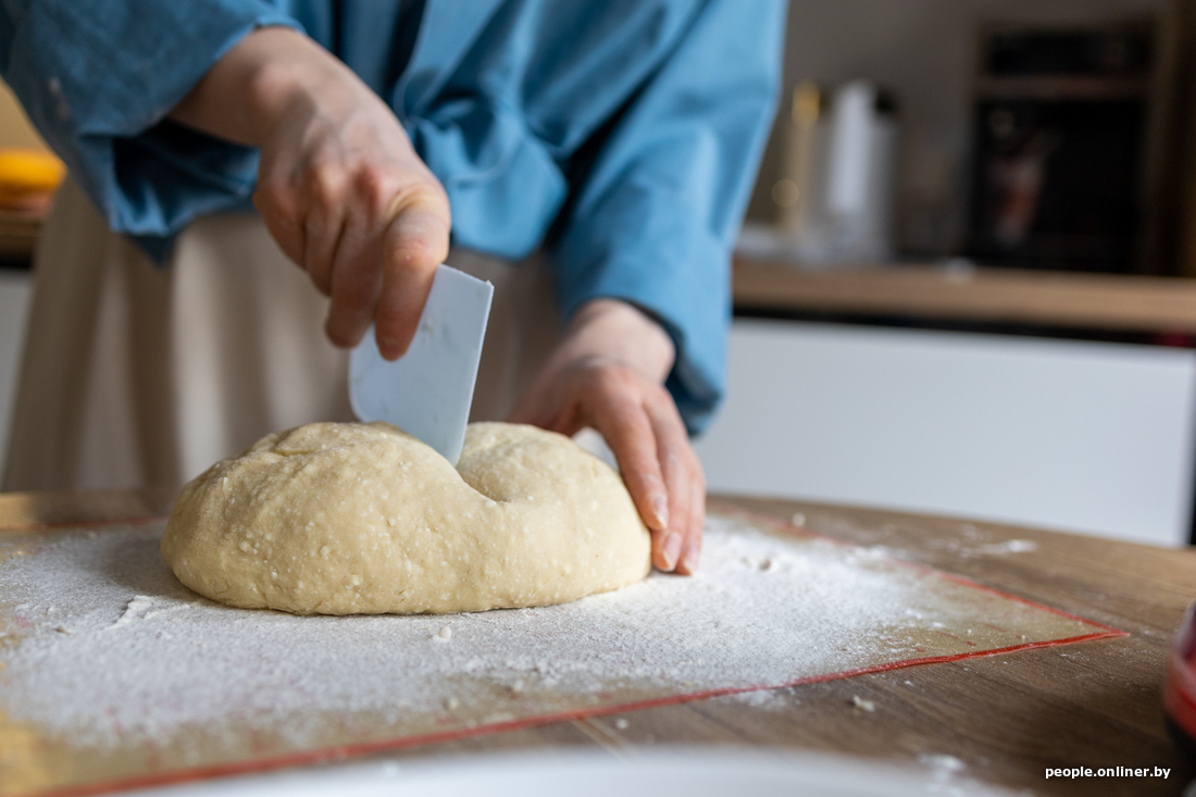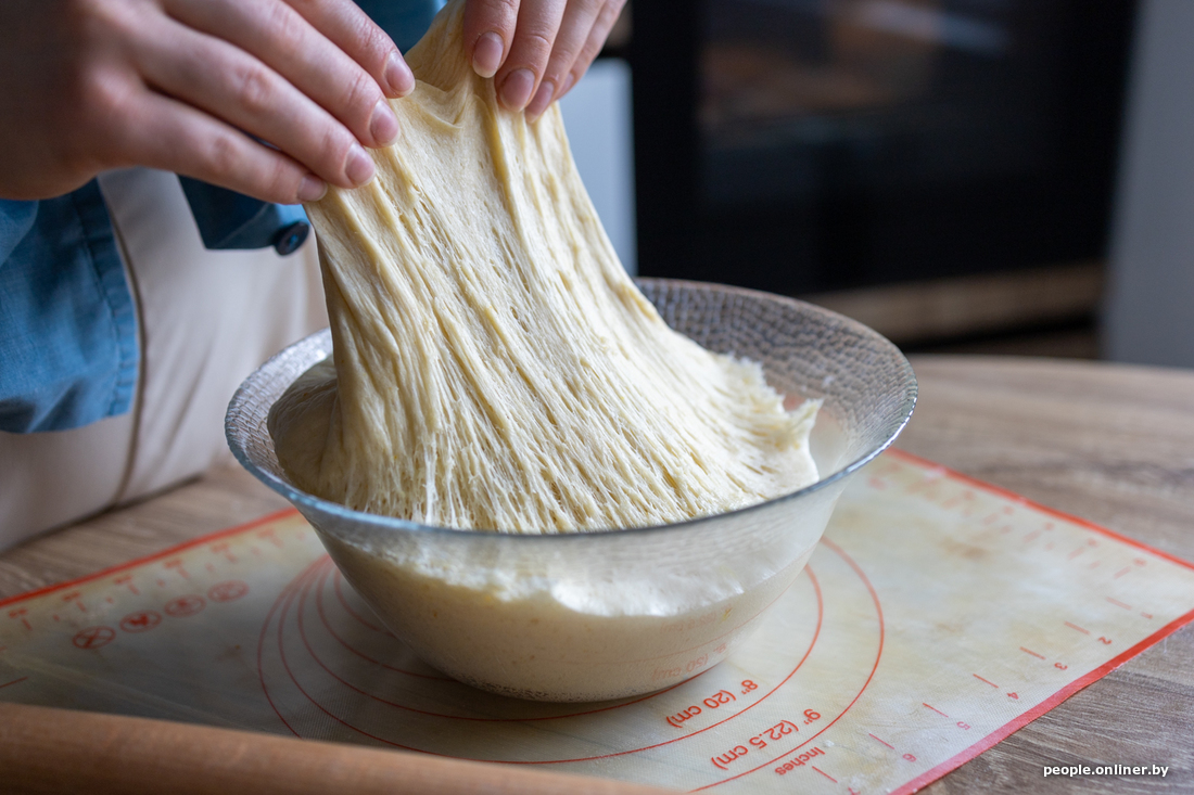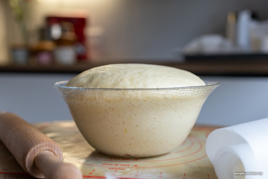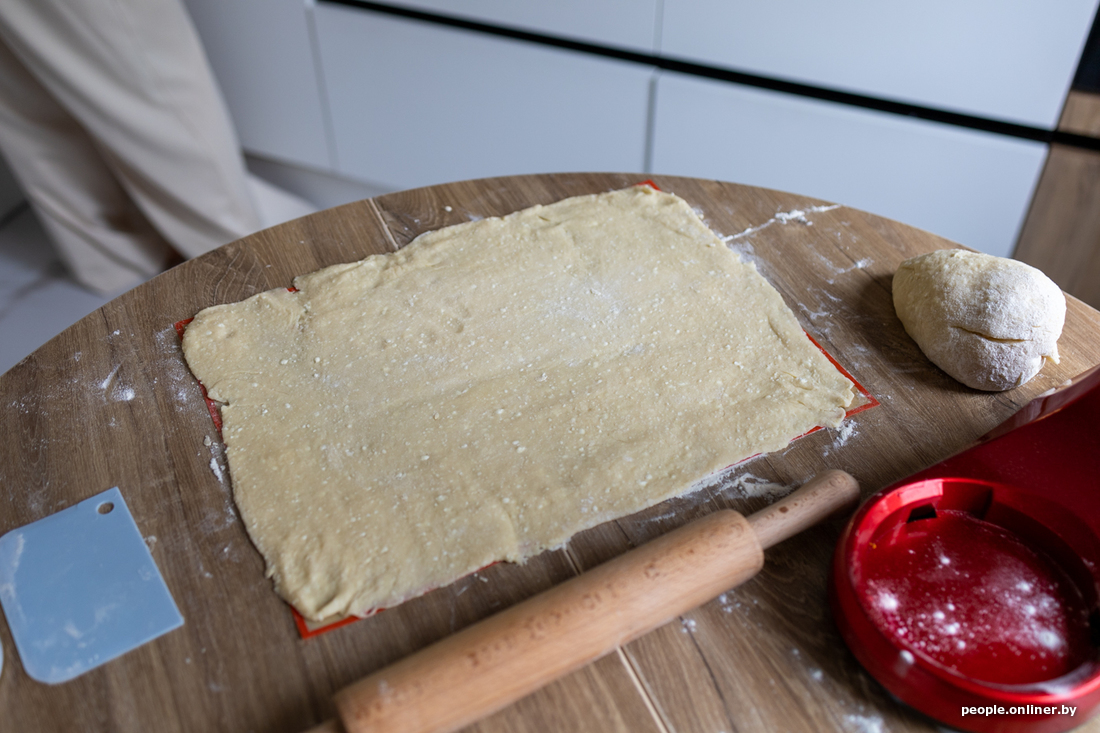 Поднявшееся тесто слегка обминаем и формируем шарик. После слегка присыпаем стол мукой и раскатываем тесто в аккуратный прямоугольник толщиной 3—4 мм.