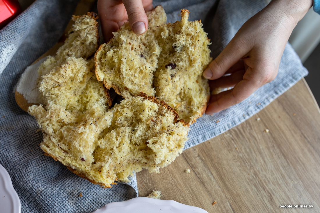 Когда куличи подошли, отправляем их в разогретую духовку на 180 градусов. Выпекаем 30—35 минут в зависимости от духовки. Готовность проверяем шпажкой — при прокалывании кулича она должна выходить сухой. Готовые горячие куличи укладываем на бок и остужаем на решетке.