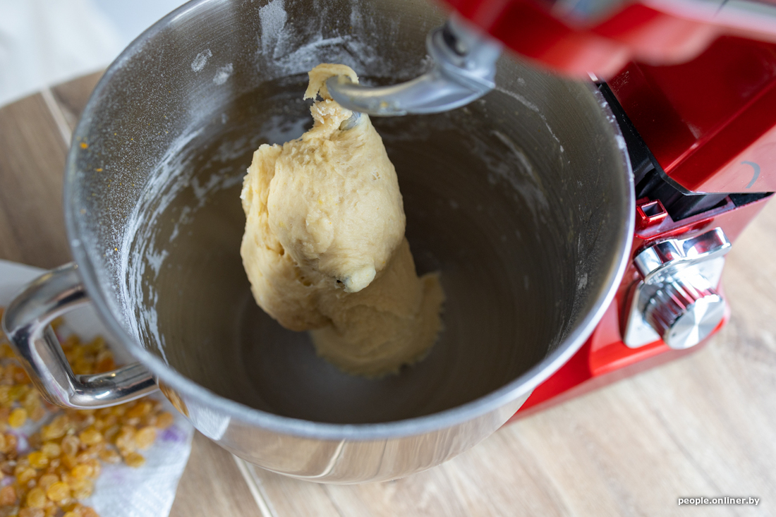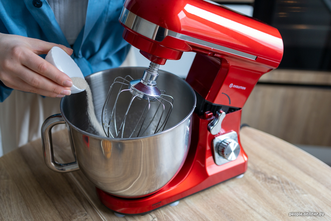 Готовить куличи мы будем с использованием планетарного миксера. У нас яркий и стильный Evolution Mr. Backer красного цвета с тремя насадками: венчиком для взбивания, крюком для теста и лопаткой для перемешивания. Его главное предназначение — замешивание теста. Но он еще может смешать любые ингредиенты, приготовить пюре, взбить яйца или белок.