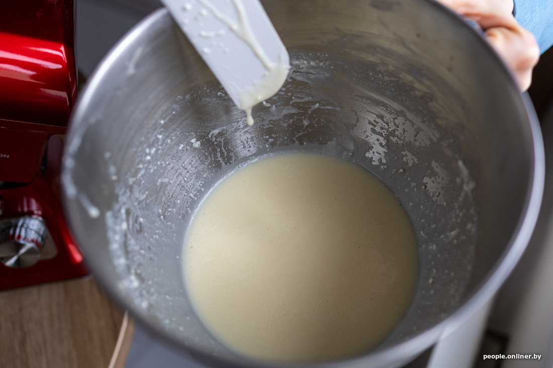 Всыпаем муку и замешиваем мягкое тесто при использовании насадки-крюка в планетарном миксере. Готовое тесто накрываем пищевой пленкой и оставляем в теплом месте на 1 час.