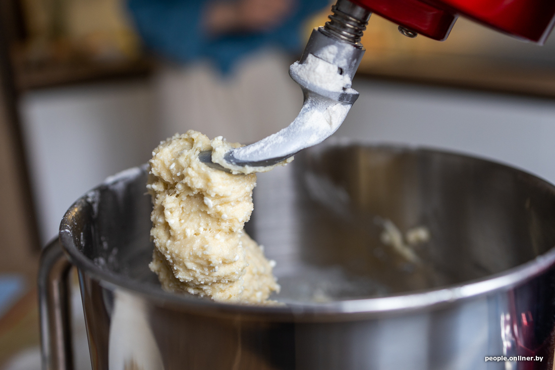 Отдельно соединяем муку с разрыхлителем. И потом порционно просеваем муку в творожную смесь и замешиваем тесто сначала венчиком для взбивания, а потом насадкой-крюком.
