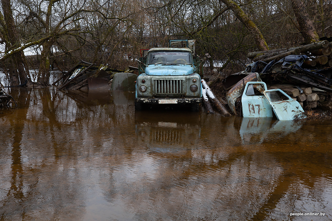 Но мы не сдались и попытались проехать другой дорогой, свернув возле старинной Иверской церкви в Мыщено. Все шло по плану, но за три километра до деревни мы оказались в грязи. Дальше пошли пешком, и через километр дорога просто превратилась в воду, открыв перед нами невероятный простор, не уступающий картинкам с Припяти.