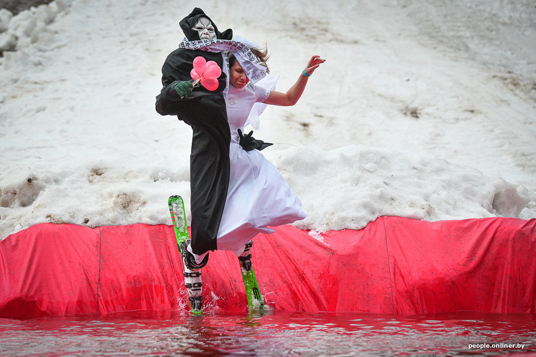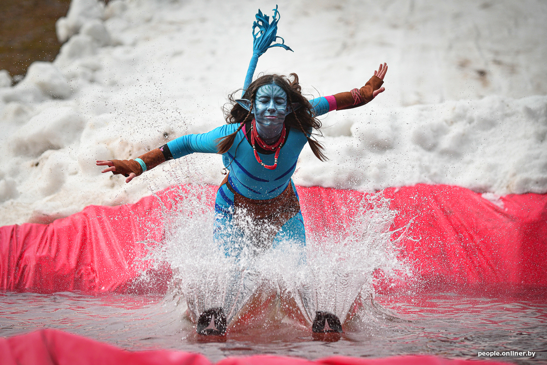 «Калифорняк» — традиционное закрытие зимнего сезона в комплексе. Для участия в соревнованиях нужно было зарегистрироваться, а еще придумать костюм. Чем безумнее — тем лучшее: по ним отдельный конкурс. Особый пункт — прыжки с погружением в бассейн.