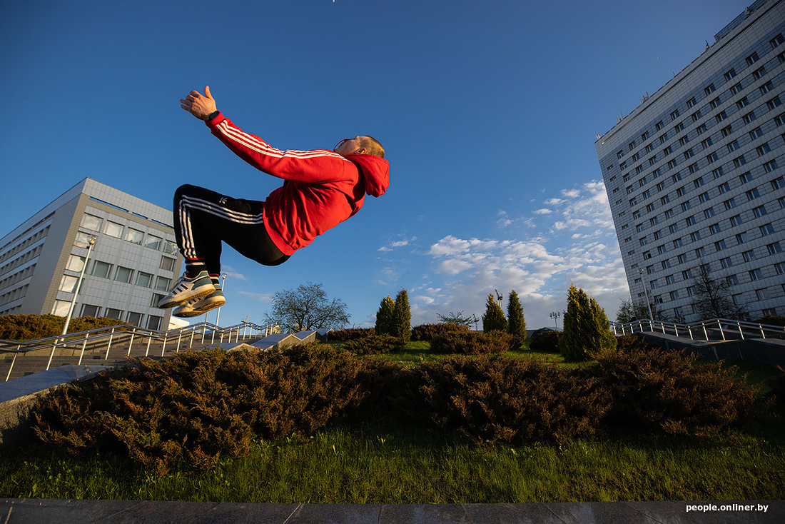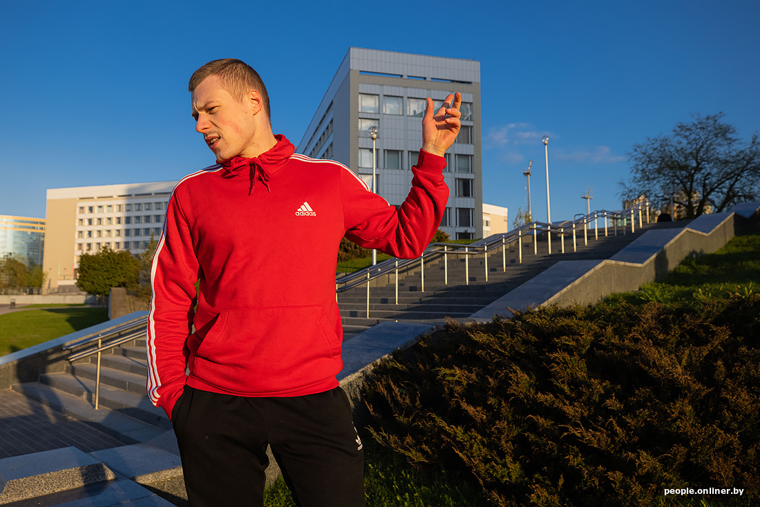 Глеб крутит арабское сальто с огромной лестницы у БГУФКа. Вместо концертного циркового костюма — привычный уличный «адик». Он шутит, что на фотках будет выглядеть как амбассадор «трех полосок». Так и есть. Люди с ближайшей остановки исподтишка поглядывают за происходящим: возможно, думают, что мы тут снимаем рекламу.