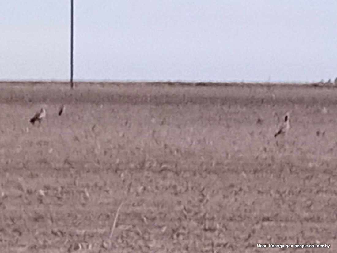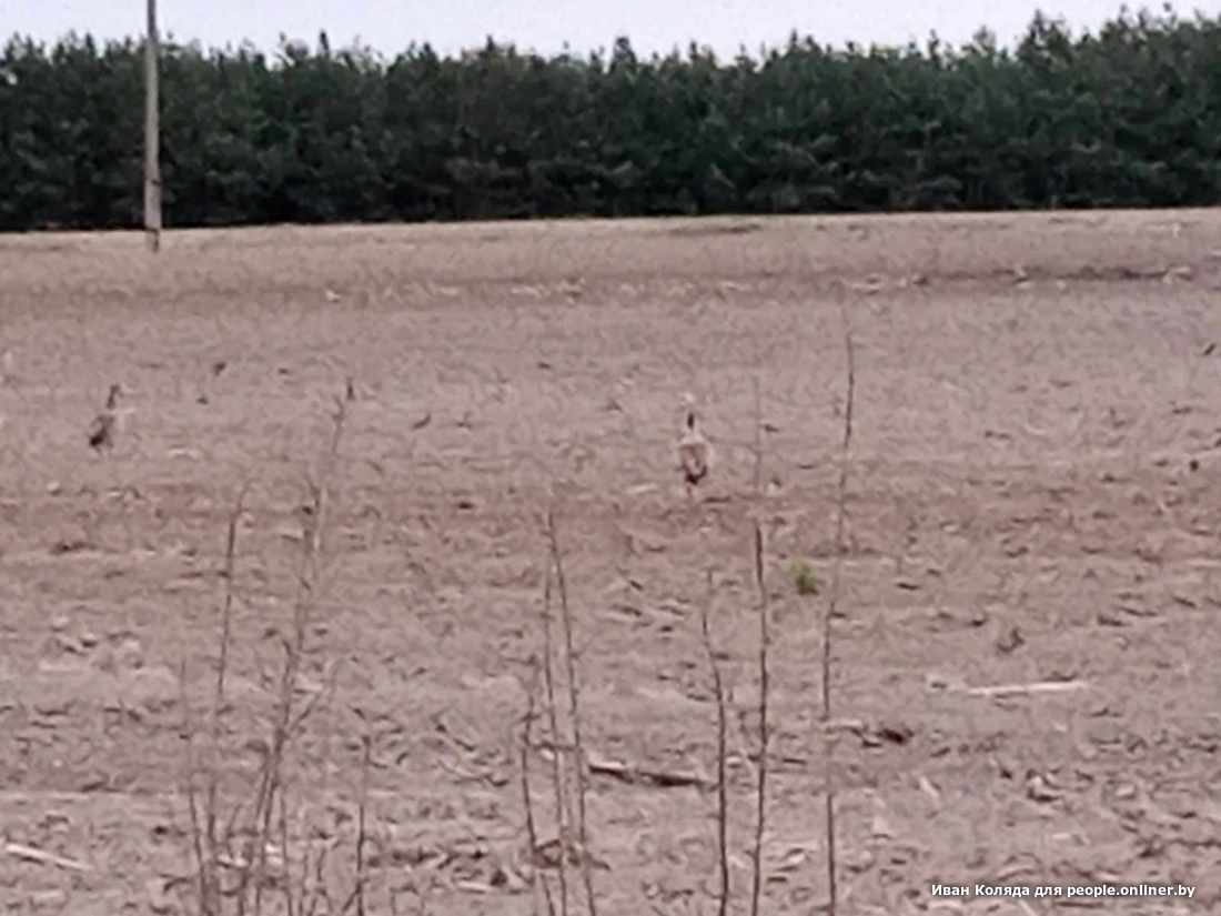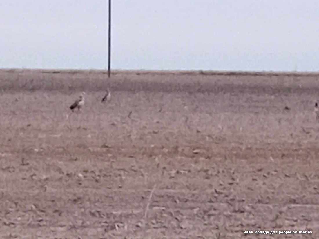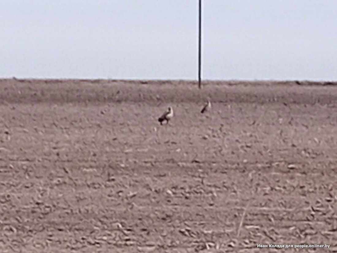 А на днях кое-что произошло в Брестской области. Орнитолог Вадим Прокопчук ссылается на охотника по имени Иван Коляда. Тот в свою очередь утверждает, что 7 мая в том же самом Каменецком районе, у деревни Ходосы, видел самца и двух самок дрофы. Иван утверждает, что очень хорошо разглядел и узнал птиц на поле недалеко от дороги. Попытался сфотографировать на телефон. Качество получилось печальное, но эти силуэты трудно спутать с любой другой белорусской птицей.