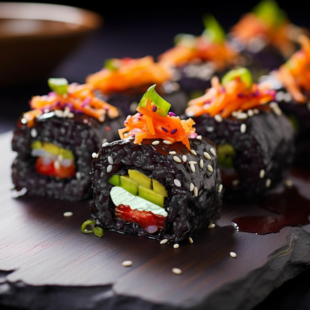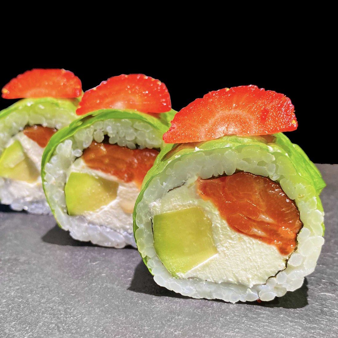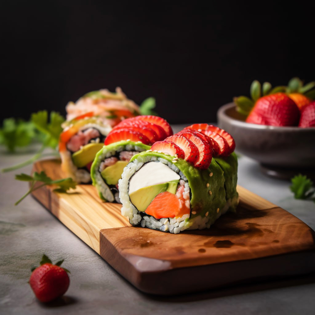 Всего ИИ изобрел четыре вида суши. В первом верхушку ролла украшает тартар из лосося, во втором есть клубника и шпинат, в третьем — дополнительная обмотка салатом айсберг, в четвертом среди ингредиентов — жареный батат.