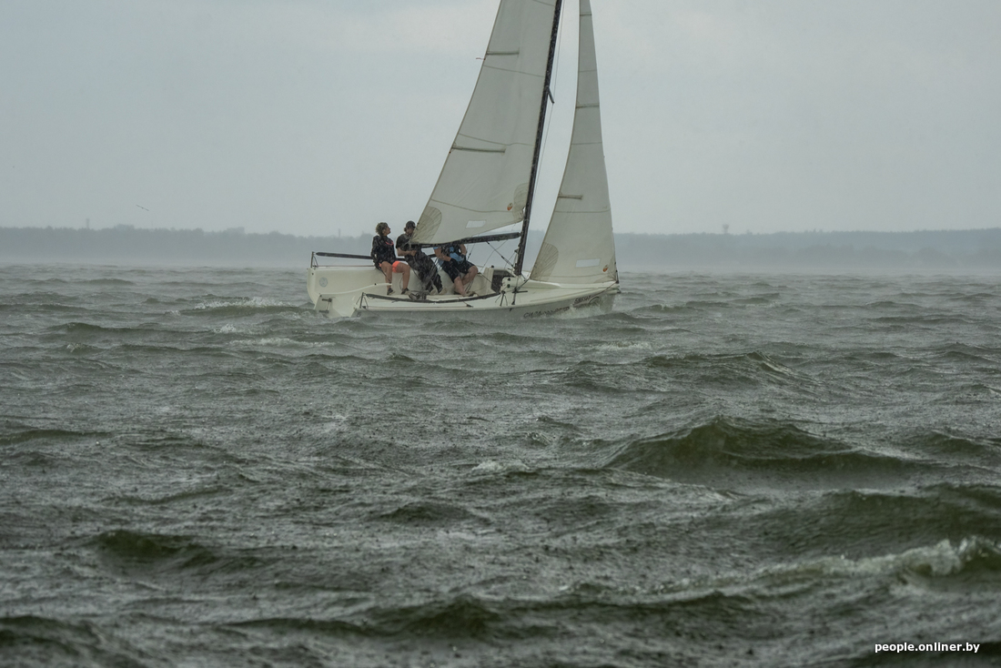 Хочешь — получаешь. В тот день погода сыграла с нами злую шутку. Пока болтали и готовили яхту к отплытию, светило яркое солнышко. Ветер был сильным, но теплым. И где-то вдалеке бродили тучи. Но через 5 минут в море погода резко изменилась: мелкий дождь мгновенно перешел в ливень, а водохранилище начало штормить так, что оно полностью оправдало название «море».