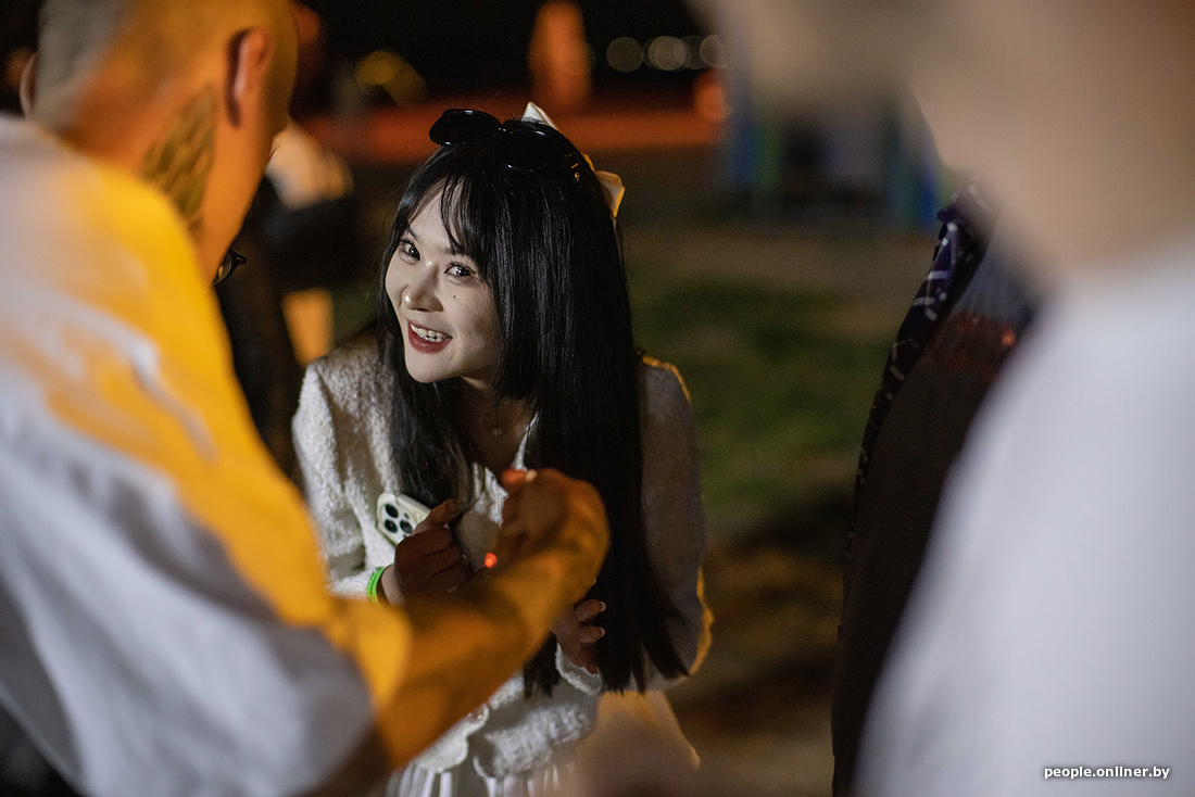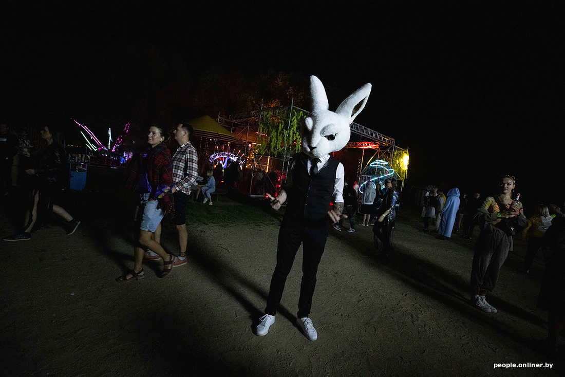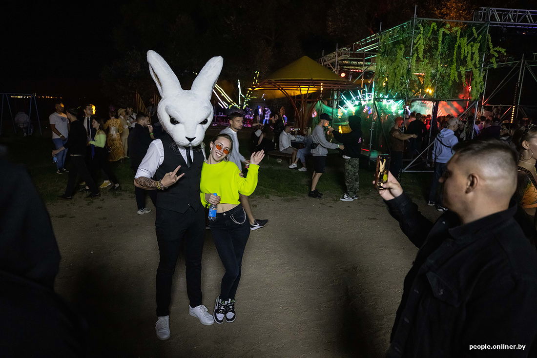 Зайца зовут Алексей, и он работает в цветочном магазине. Огромную ушастую голову парень заказывал доставкой специально для подобных мероприятий. Говорит, что в ней тепло, и это очень кстати, учитывая довольно прохладный ветерок на Минском море. Во рту заячьей головы есть специальная сеточка, которая позволяет Алексею не врезаться в препятствия. Украдкой глянул, есть ли у зайца за спиной батарейка. Если вас тоже «флешбэкнуло» от этого образа из легендарной рекламы нулевых — вы не одиноки.