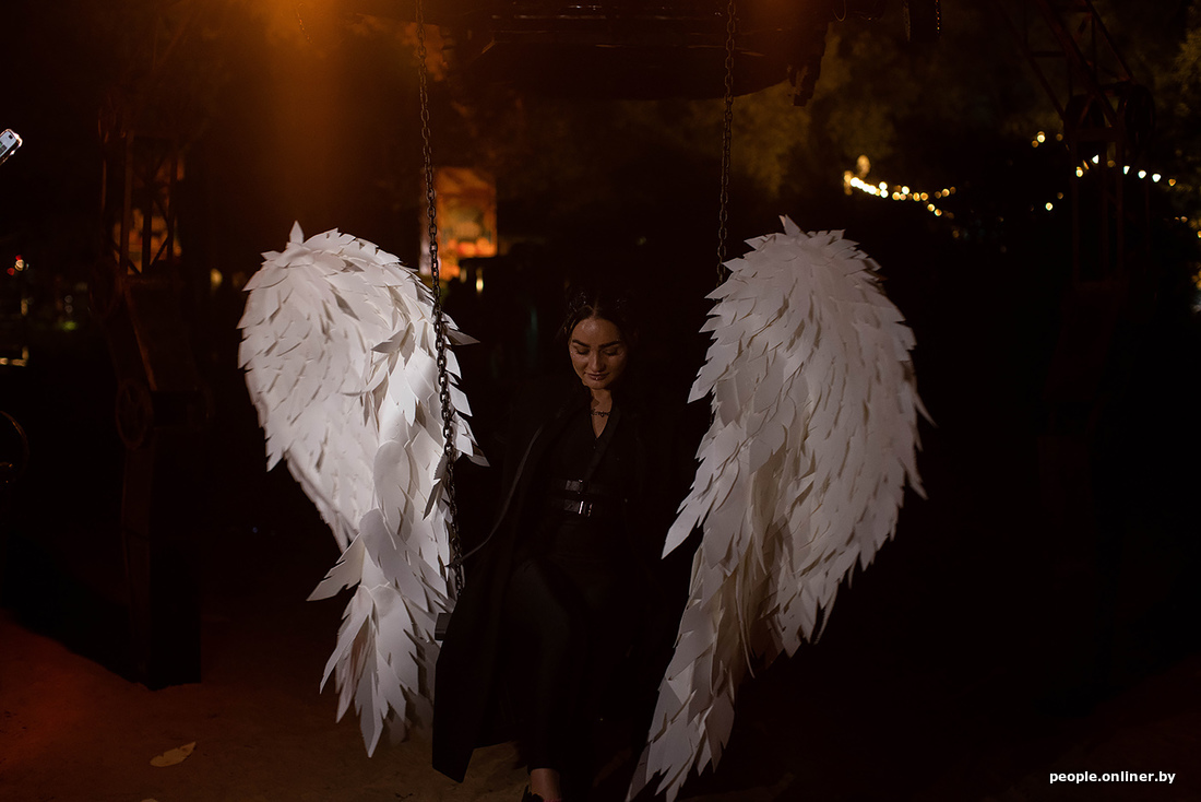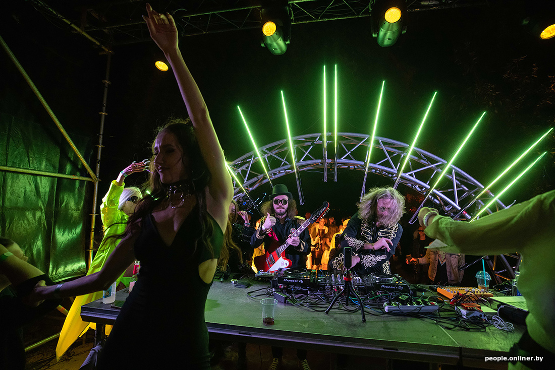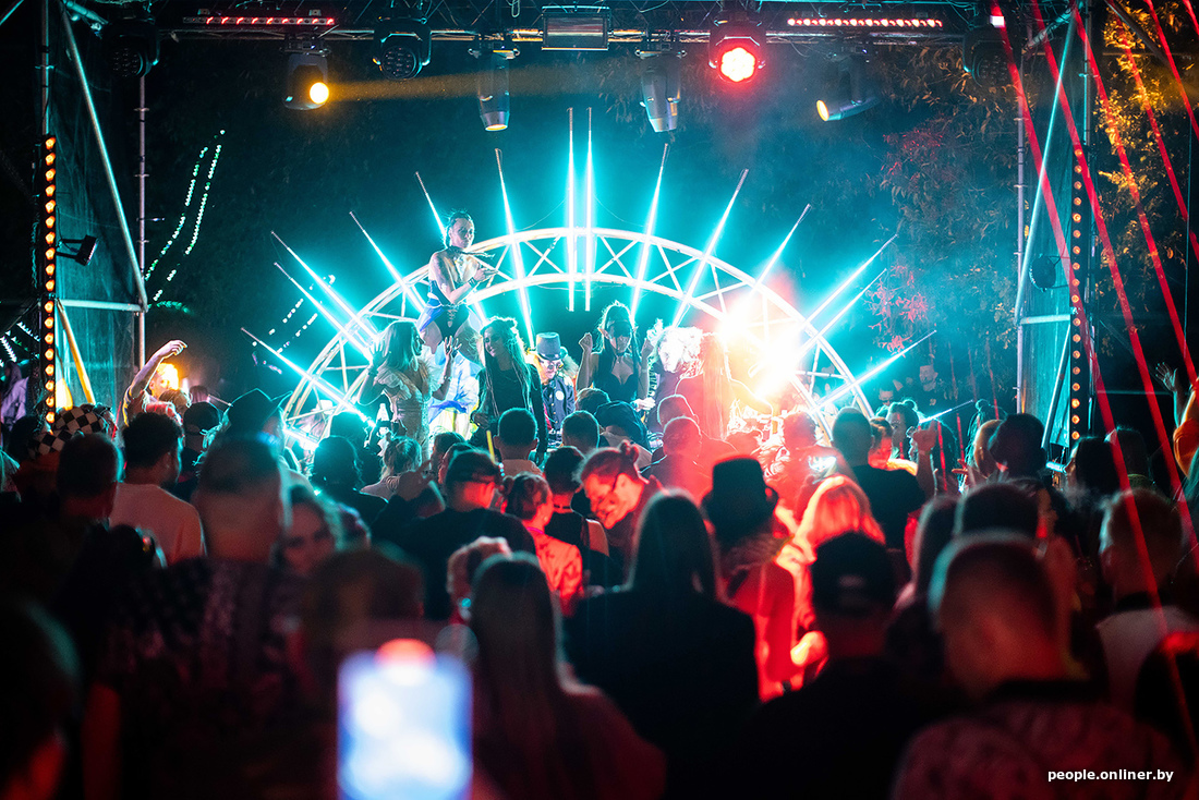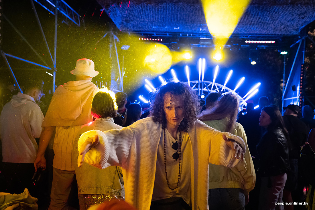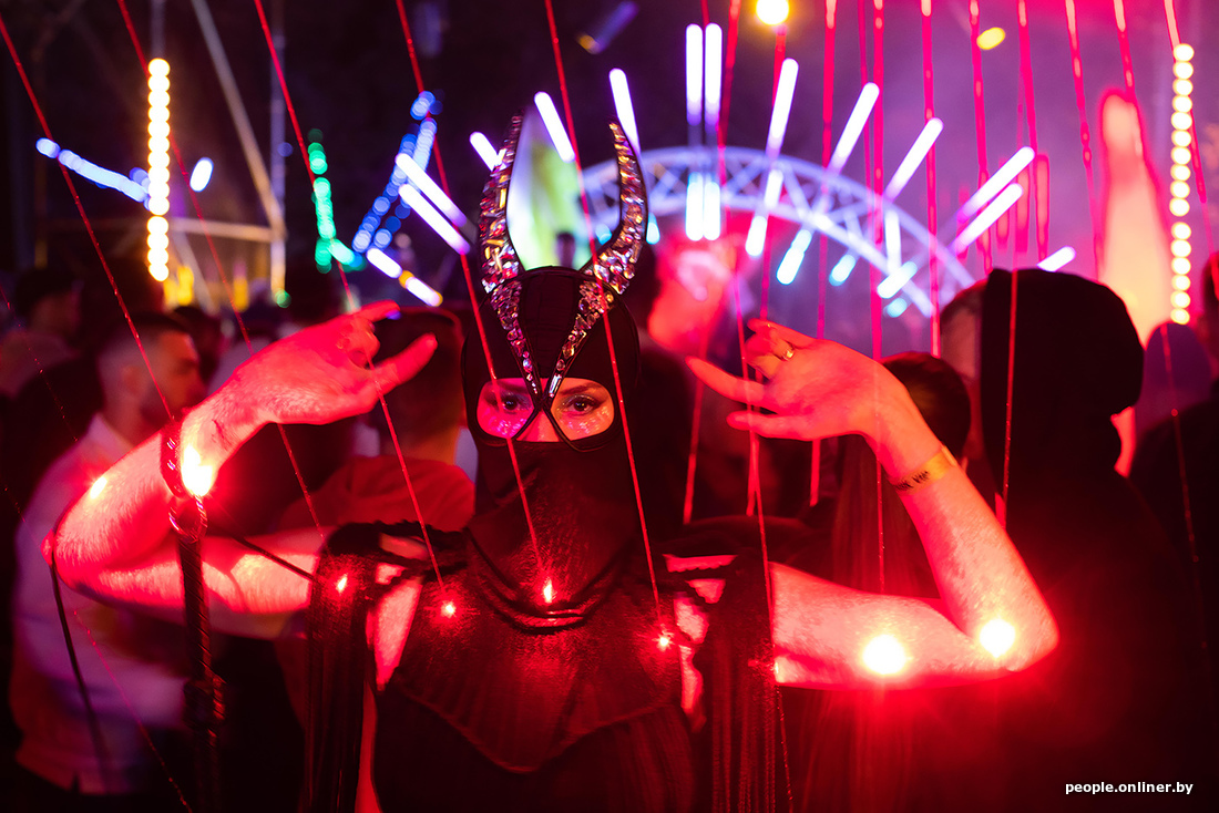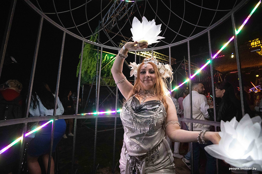 Давайте-ка я все-таки вам коротко расскажу об устройстве Burning Minsk. Как мы уже знаем, в центре всего этого безумия — огромный киберпанковый паук Жора. К пузику Жоры подвешены качели с ангельскими крыльями — самая популярная фотозона феста, особенно среди девушек. Справа от Жоры — главная сцена. Вся в неоне, с крутыми декорациями и большой круглой клеткой на входе, куда периодически залазили пофоткаться и потанцевать в основном захмелевшие мужички-приколисты. На танцполе — все сливки. Каждый третий в каком-то ярком костюме.