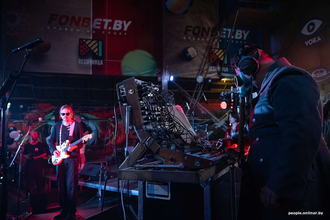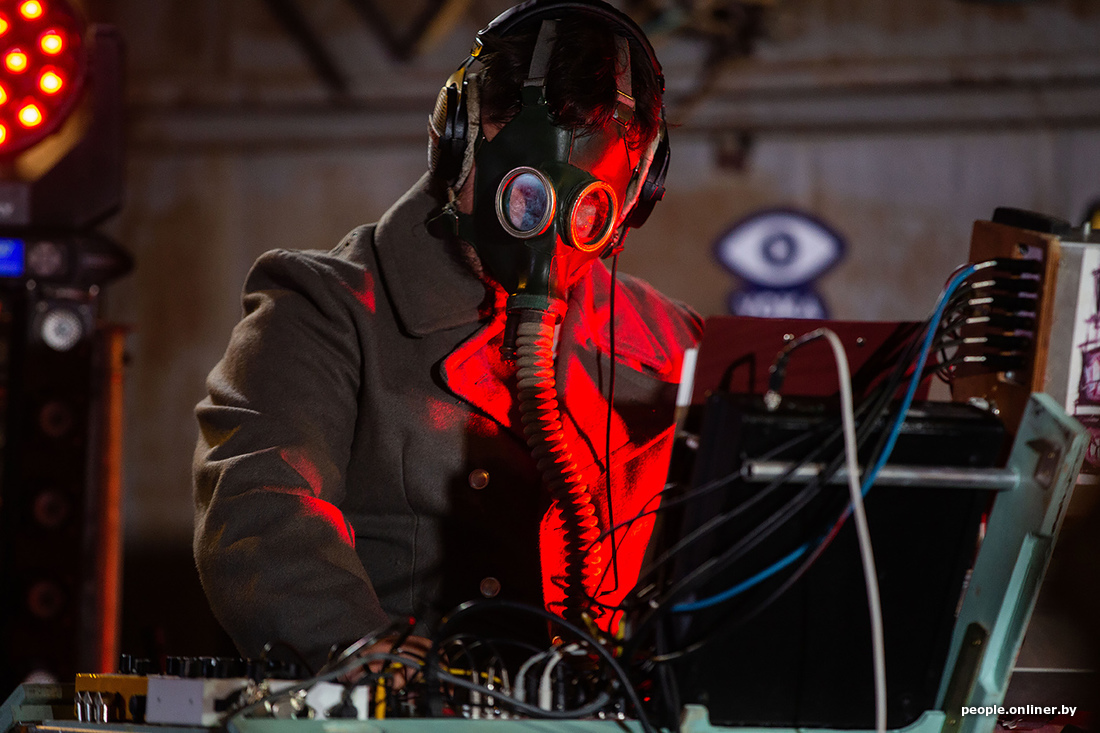 У солиста в дырявый кофте на шее цепь, за барабанами — девочка, за странными синтезаторами с кучей проводков — диджей в противогазе. Слушайте, а это уже многообещающее начало! Говорят, что под противогазом скрывается один из бывших участников легендарной «Серебряной свадьбы». Это вполне объясняет тягу к театральности.