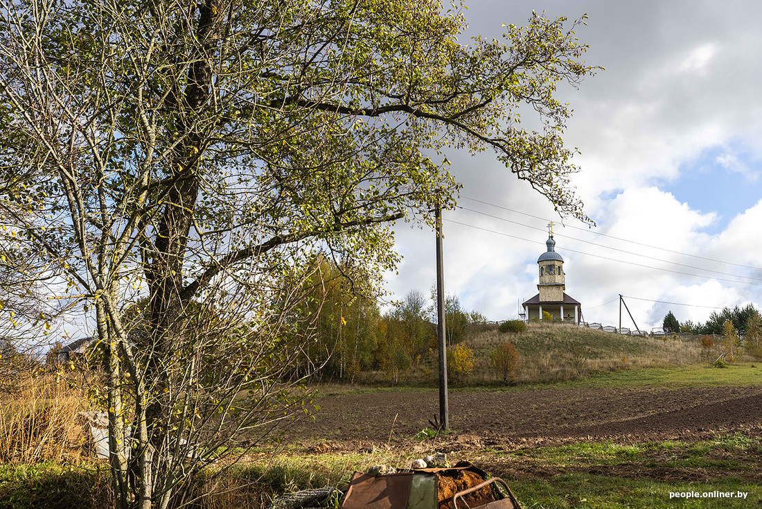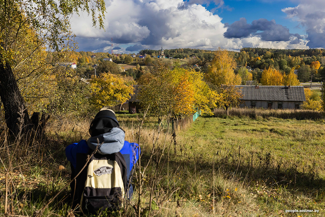 Мы лежим на холме, солнце нетипично для октября жарит. Попробовал бы я в Минске так полежать на травке — вопросы у окружающих возникли бы минут через пять. А тут можно делать так сколько угодно, прямо посреди дня — кайф. Грибов только нет от слова «совсем». Но зато есть симпатичные виды. Матвей рассказывал, что на этом холме любят палить большие костры. А так как он находится прямо напротив «церкви на горе», вид снизу во время заката открывается эпичный: справа горит костер, слева блестит на солнце крест на куполе церкви. Звучит как что-то, что должно было стать сюжетом клипа на песню Корнелюка «Там для меня горит очаг». Но, увы, он так и не доехал на съемки в Олехновичи, пусть и родился в Бресте. Ладно, пора спускаться вниз.