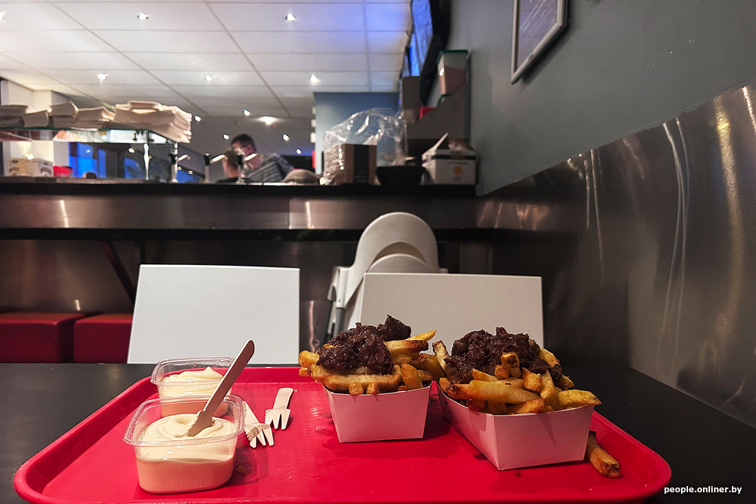 Пробуем соусы вслепую. Первый — очень нежный, слегка сырный, по текстуре и плотности именно что соусный. Второй тоже ничего, но больше напомнил кисловатую жидкую сметану. Отдаем свой балл первому — оказалось, это нидерландский. При этом выяснилось, что у посетителей в фаворитах чаще ходит как раз версия из Бельгии.