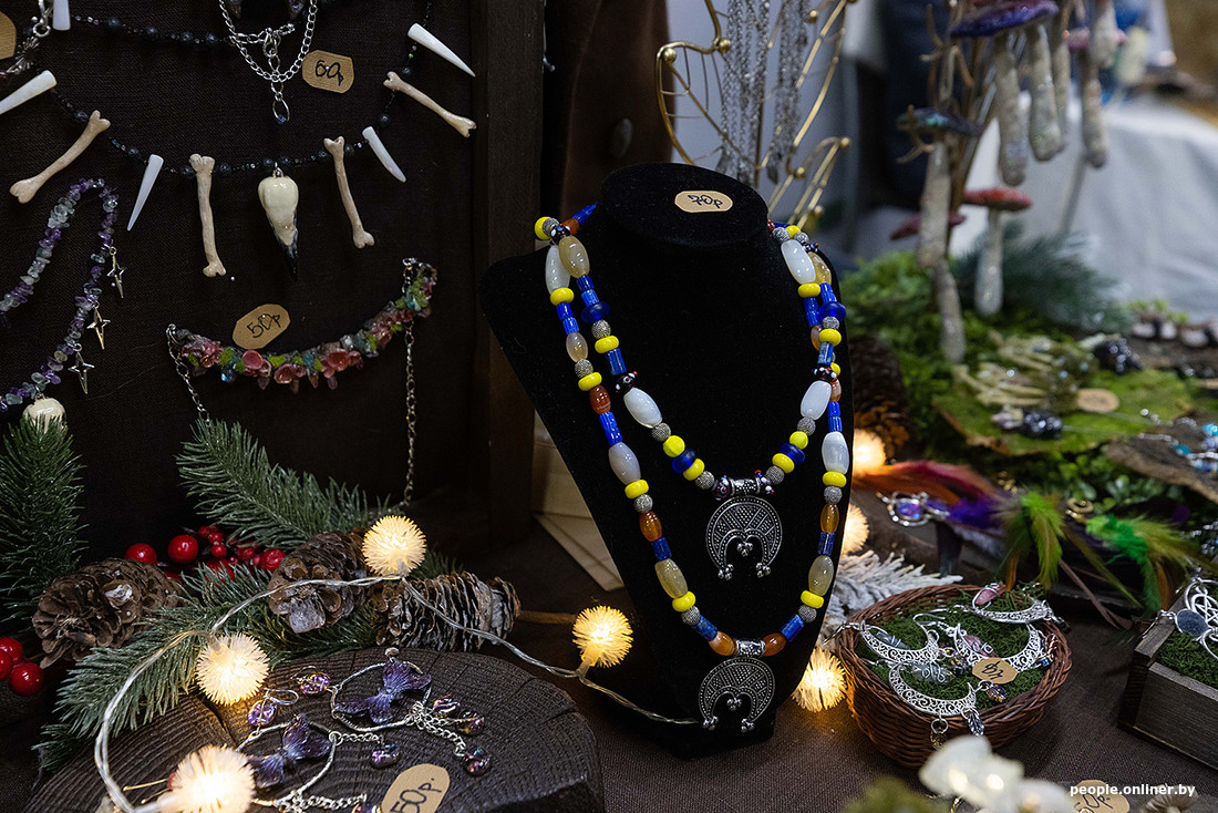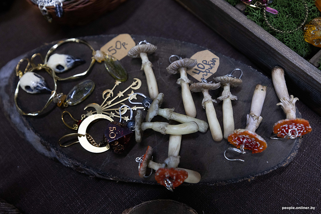 Первой, с кем мы решили познакомиться, была эльфийка Вероника и ее поросший мхом стенд. Не заметить или проигнорировать такое было невозможно. Девушка делает различные украшения, вдохновленные фэнтези-мирами и ролевыми играми вроде «Подземелий и драконов». Кто бы мог подумать, но зубастые грибы, гномы и тролли еще как могут быть украшениями. Однако, как оказалось, Веронику интересуют не только выдуманные миры: некоторые ее работы имеют под собой прямо-таки научную основу.