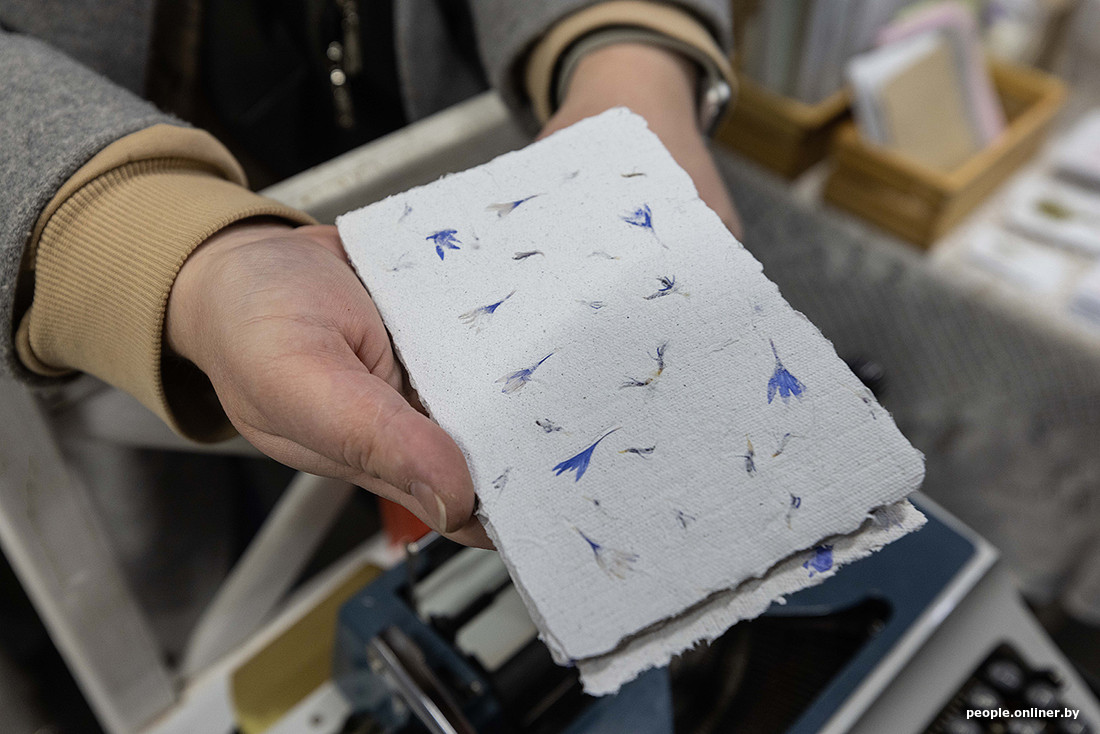— Я стала экспериментировать: высушивать бумагу на льне для более приятной фактуры, добавлять в нее цветы — васильки, одуванчики — это все нужно обязательно делать в день сбора. Получается вот такая красота. Для открыток вообще идеально. Вот стоит печатная машинка — давайте вам оставим привет какой-нибудь.