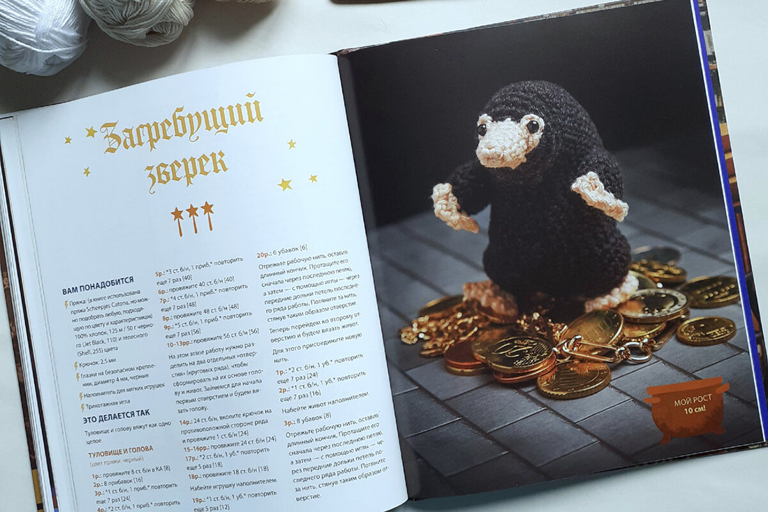 Книга для рукоделия, но с фишкой и выглядит как самая что ни на есть подарочная: она красивая, с качественными фото и глянцевыми страницами. Обучающий раздел вполне подойдет для новичков: все проиллюстрировано и понятно описано. Следуй инструкции — и все получится. Схемы точные и исходят из правила от простого к сложному, а к последним страничкам та-дам… собирается коллекция любимых персонажей с распределяющей шляпой и снитчем в придачу.