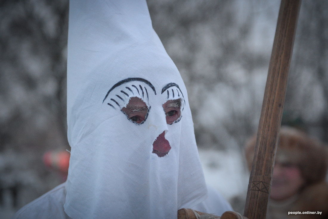 Пока одни продолжали щедровать по хатам, другие пришли в центр Давид-Городка — здесь организовали большой праздник: с аттракционами, песнями, танцами и прочими развлечениями. Здесь мы и встретили персонажа с перевязанным лицом.